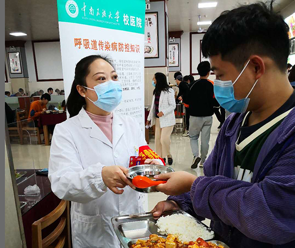 秋冬季是呼吸道傳染病高發季節,10月28日至30日,校醫院組織醫護黨員到學校各大食堂開展“預防呼吸道傳染病——中藥湯劑飲服”活動,免費為全校數萬名師生提供中藥湯劑。