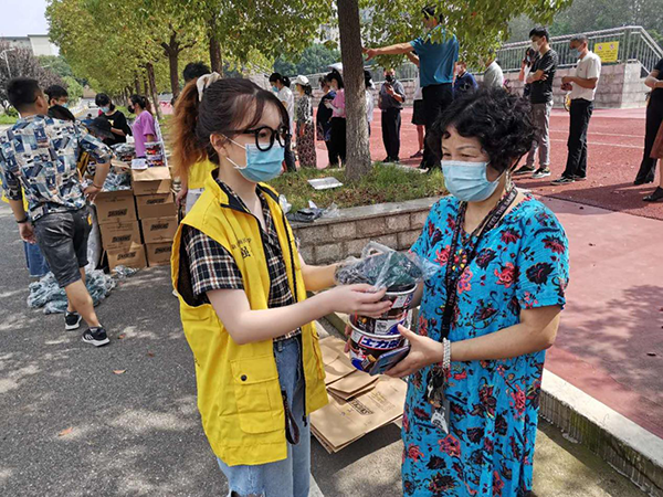 志愿者為學(xué)校宿舍管理員送上加油包。學(xué)生工作處供圖