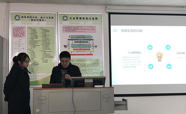 同學們以組為單位,運用PPT演示+項目實際操作的方式進行了成果匯報。由企業指導老師和信管系老師組成的評委團對項目進行評審打分,最終評出了優秀項目、優秀項目管理組長等獎項,并為每位參加實訓的同學頒發了結業證書。