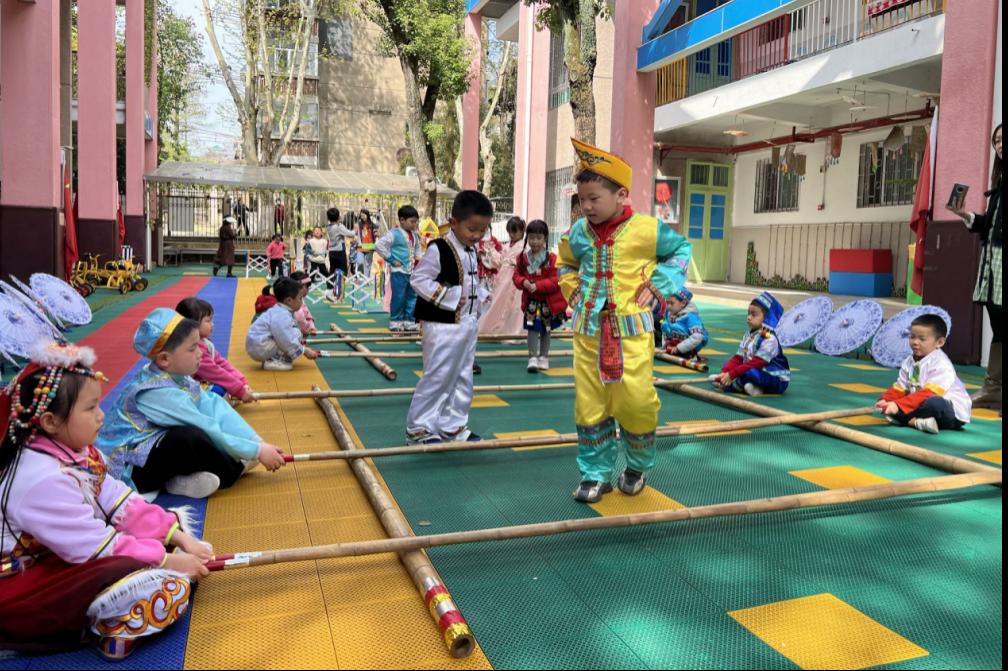 這邊,伴隨著歡快的音樂節奏,大班的孩子們身著漂亮的服飾,輪流扮演角色,在竹竿有節奏、有規律的碰擊聲里,敏捷地進退跳躍,瀟灑自如地做著各種優美的動作。“嘿!呵嘿!”場面極是豪邁灑脫,熱烈有趣。