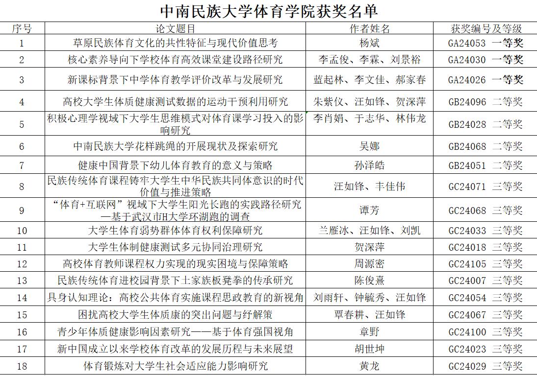 5月12—14日,湖北省第二十四屆學校體育科學論文報告會在赤壁市召開。我校體育學院師生表現優異,共有18篇論文獲獎,其中一等獎3篇、二等獎4篇、三等獎11篇,體育學院獲“優秀組織獎”。