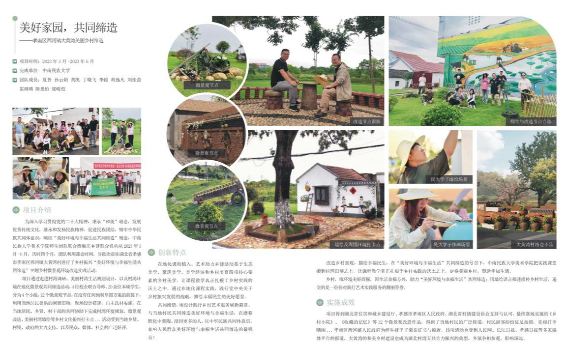 此次入選案例成果,是美術學院環境設計專業夏晉教授工作室師生團隊聯合西廂房鄉建聯合機構于2023年3月-6月間,利用課余時間完成的“美好環境與幸福生活共同締造”主題鄉村微景觀環境改造實踐活動之一。該項目通過走進村灣調研、美麗村灣生活規劃設計,以及村灣環境在地化微景觀共同締造活動,基于生態美學、聚落美學、美學經濟和鄉村美育4項核心要素的鄉村美學,將課程教學真正扎根于鄉村實踐的沃土之中。通過在地化課程實踐,在沒有任何預制草圖方案的前提下,團隊師生利用當地居民提供的閑置舊物,現場設計搭建,自主選材實施,在當地居民、鄉賢、村干部的共同協助下完成村灣環境規劃、微景觀改造、美麗村灣墻繪等鄉村文化振興打卡點,描繪了幸福民生的美好愿景,得到了當地人民群眾的一致好評。