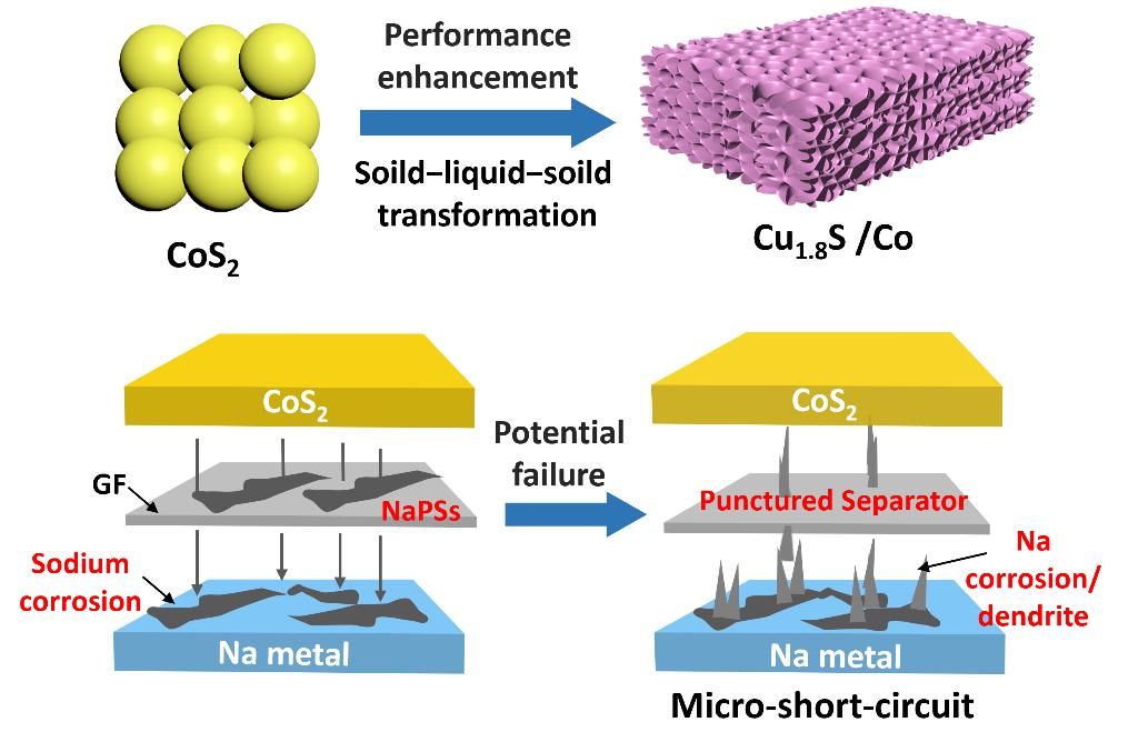 CoS2儲(chǔ)鈉性能增強(qiáng)、電池失效機(jī)制示意圖。 化材學(xué)院供圖