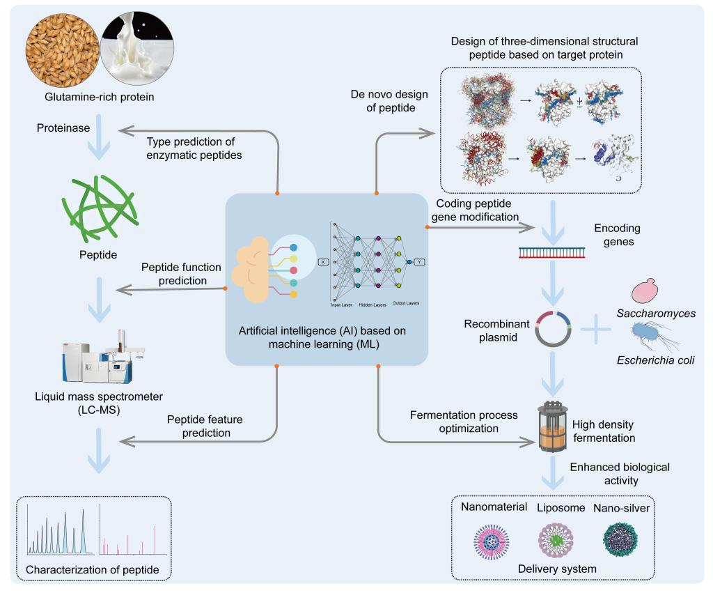 該綜述特別探討了人工智能(AI)和合成生物學在谷氨酰胺營養肽生產中的應用潛力,希望通過AI加速更多具有生物活性的谷氨酰胺營養肽的發現,并進一步對肽的結構進行優化,同時利用細胞工廠技術實現谷氨酰胺營養肽的生物制造。本文首次提出一個基于AI的多技術集成系統,將極大促進谷氨酰胺營養肽作為功能性食品原料的研究進程,同時為其他功能性肽的智能制造提供范式,為未來功能性食品的開發提供重要的理論和實踐支持,將極大促進大健康產業的發展與升級。