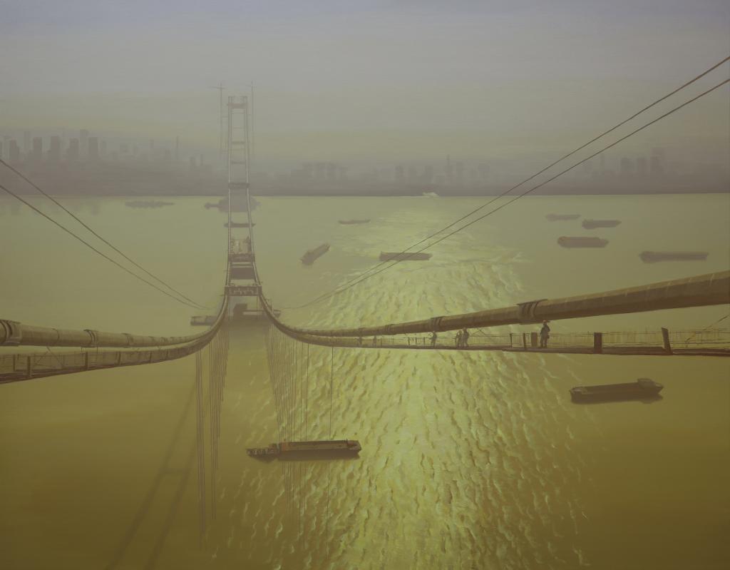 作品《長虹臥波》取材武漢長江上的建橋場景,在寬闊的水面上空,大橋纜索橫跨,氣勢如虹。作品描繪了現代建橋技術下,勞動人民不斷創造天塹變通途的新壯舉,實現古人“長虹臥波”的理想圖景,借古詠今,歌唱偉大新時代。