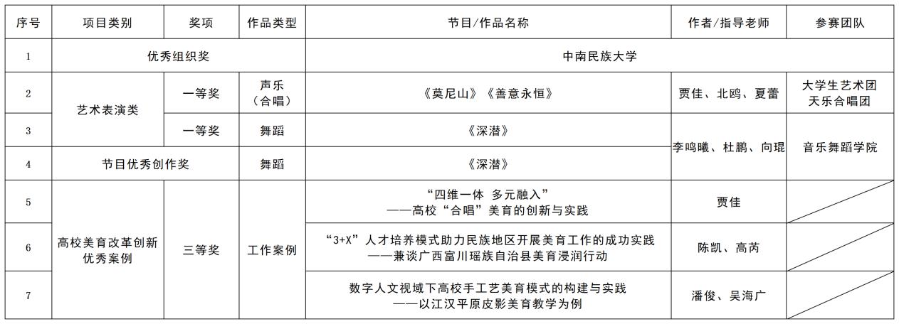 7月底,教育部辦公廳公布全國第七屆大學(xué)生藝術(shù)展演活動優(yōu)秀組織獎(jiǎng)及各項(xiàng)目評選結(jié)果,我校選送作品斬獲全國一等獎(jiǎng)2項(xiàng)、三等獎(jiǎng)3項(xiàng)、優(yōu)秀創(chuàng)作獎(jiǎng)1項(xiàng),學(xué)校榮獲高校優(yōu)秀組織獎(jiǎng)。