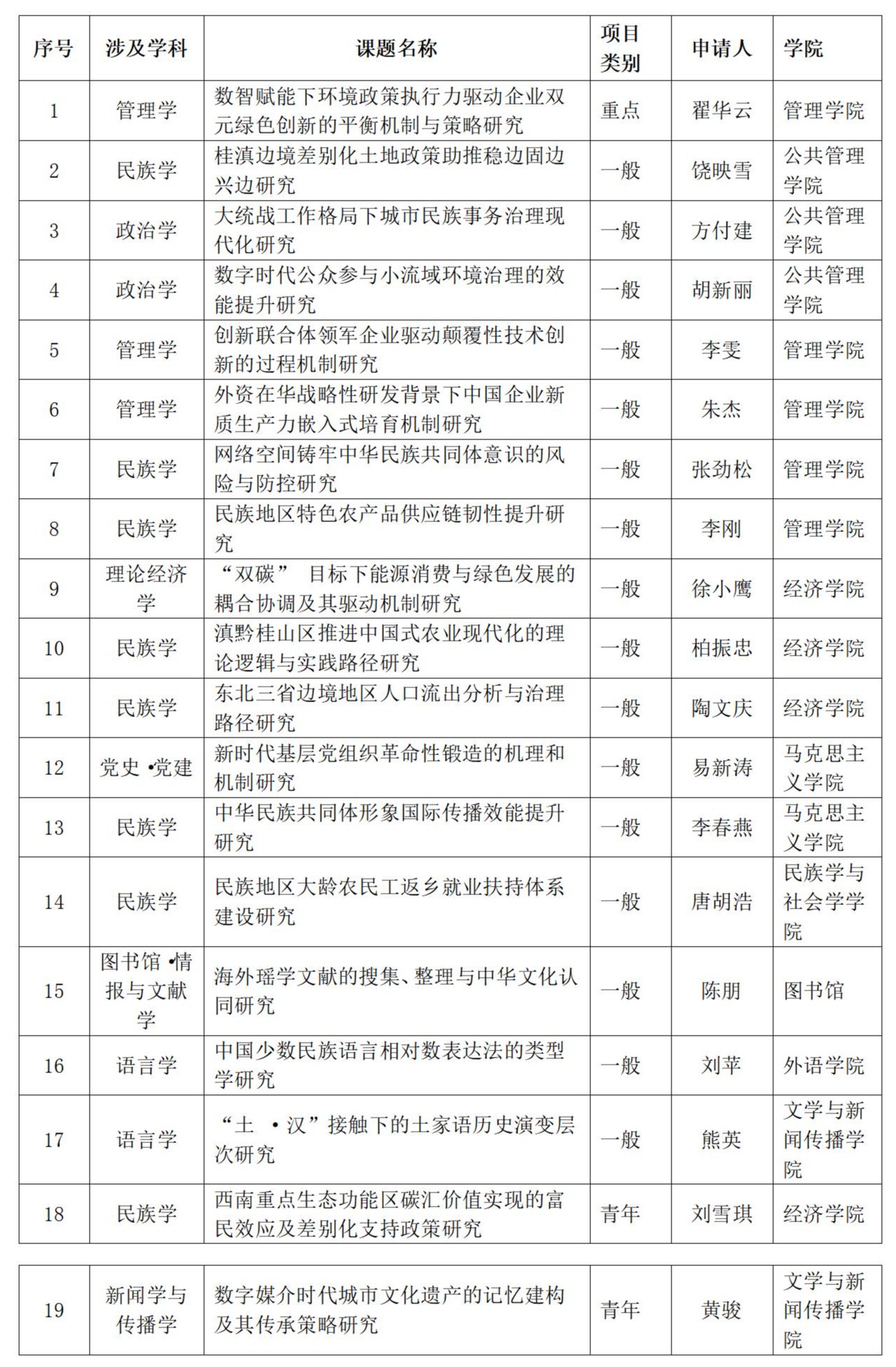 本次國(guó)家社科基金年度項(xiàng)目立項(xiàng)的項(xiàng)目覆蓋8個(gè)學(xué)科,其中民族學(xué)獲批立項(xiàng)8項(xiàng),含一般項(xiàng)目7項(xiàng)和青年項(xiàng)目1項(xiàng),民族學(xué)學(xué)科立項(xiàng)數(shù)排名全國(guó)高校第一;管理學(xué)獲批立項(xiàng)3項(xiàng),獲批管理學(xué)重點(diǎn)項(xiàng)目1項(xiàng)和一般項(xiàng)目2項(xiàng);政治學(xué)、語(yǔ)言學(xué)各獲批立項(xiàng)2項(xiàng)。