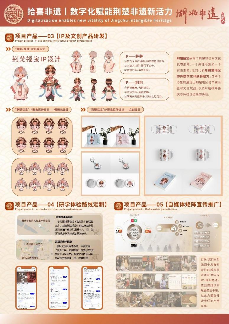 此次大賽我校共有31支參賽隊(duì)報(bào)名,經(jīng)專家組評(píng)選,有17件優(yōu)秀作品獲得了省賽推薦資格。在省賽評(píng)選中,共有3件作品入選前100名,進(jìn)入復(fù)賽環(huán)節(jié)。其中由曾浩、李超、李赟、王雪卿等同學(xué)創(chuàng)作的文創(chuàng)作品《拾喜非遺丨數(shù)字化賦能荊楚非遺新活力》入圍前20名,獲得了復(fù)賽路演決賽資格,最終獲得二等獎(jiǎng)。