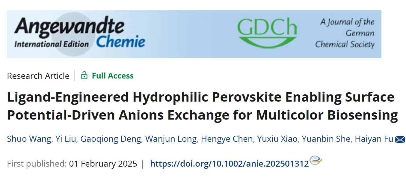 2月1日,我校藥學院付海燕教授團隊在鈣鈦礦型多色生物傳感分析新方法及應用的研究取得重要進展。研究成果以Ligand-Engineered Hydrophilic Perovskite Enabling Surface Potential-Driven Anions Exchange for Multicolor Biosensing”為題發表于國際著名期刊Angewandte Chemie International Edition(《德國應用化學》)。