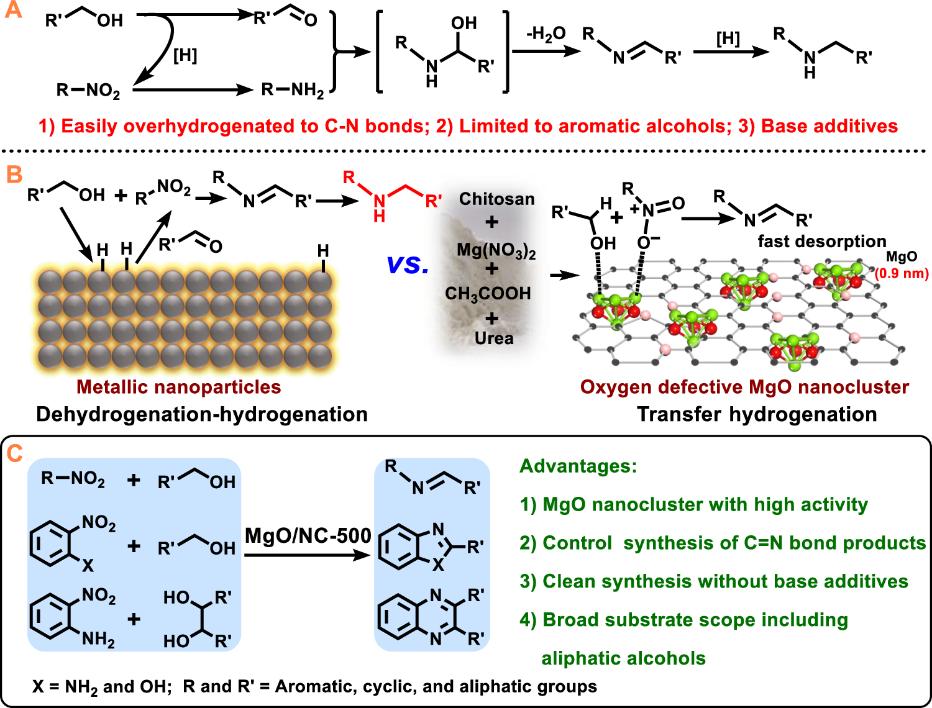 不飽和C=N鍵的選擇性構建在化學和生物學中非常重要,具有C=N鍵的有機含氮化合物,如亞胺和氮雜環化合物等廣泛應用于精細化工、材料科學、藥物研究、染料和顏料工業等領域。通常,C=N鍵的構建可以通過伯胺氧化(偶聯)以及醛/酮與胺縮合實現。由于胺可由硝基化合物還原制得,而醛/酮可由醇氧化或脫氫獲得,因此,采用硝基化合物和醇“一鍋法”還原偶聯直接構建C=N鍵可有效提高原子利用率,避免了多步反應及中間的純化步驟,可簡化工業生產工藝。但是,硝基化合物與醇還原偶聯選擇性構建不飽和C=N鍵極具挑戰性,因為C=N鍵容易進一步還原為C-N鍵。此外,目前的方法多數局限于外加堿添加劑的活性芳香醇還原偶聯。因此,合理設計新型催化體系,實現無添加劑條件下底物范圍廣泛的硝基化合物與醇的還原偶聯制備含C=N鍵高值化學品具有重要的研究意義。張澤會教授課題組使用廉價的Mg(NO3)2、殼聚糖和尿素通過乙酸交聯后簡單熱解的方法制備了氮摻雜碳材料負載MgO納米團簇(MgO/NC-500)催化劑,能高效催化醇和硝基化合物還原偶聯合成超過54個結構多樣的亞胺、苯并唑和喹喔啉類有機含氮化學品,產率為86-99%。這項研究為設計地球上儲量豐富且成本低廉的主族元素催化劑用于一些具有挑戰性的有機轉化提供了有價值的參考。