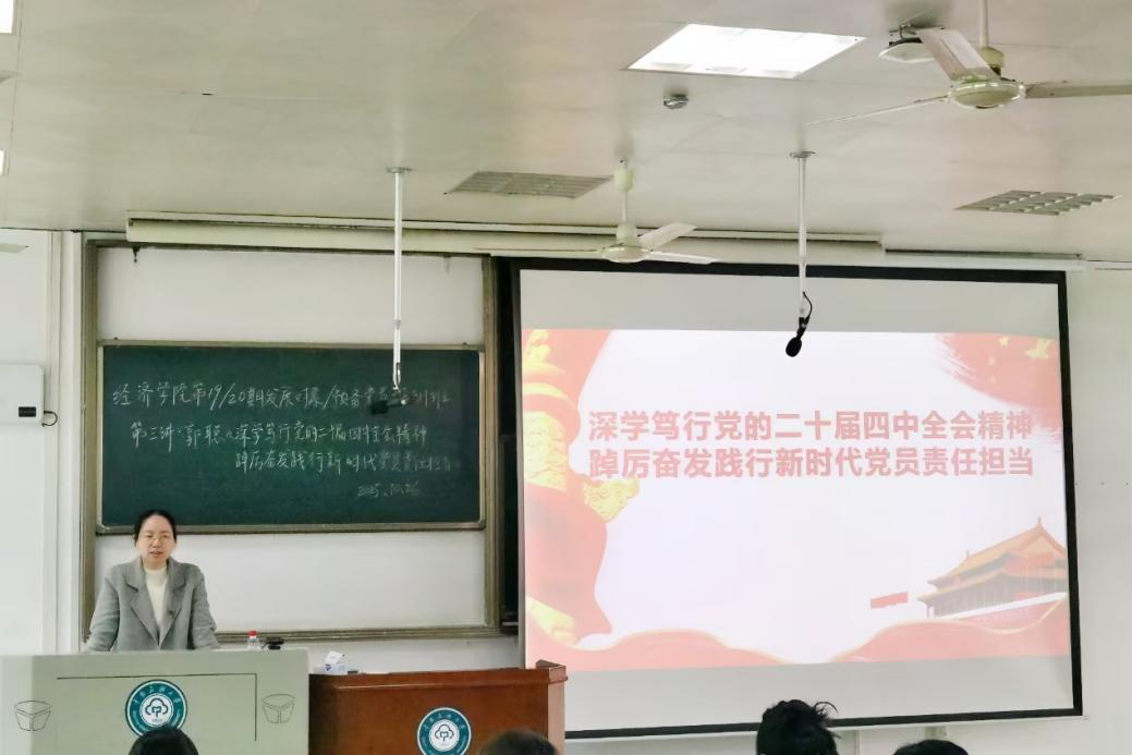 為深入學習貫徹黨的二十屆四中全會精神,10月26日上午,經濟學院黨委書記郭聰以“深學篤行黨的二十屆四中全會精神踔厲奮發踐行新時代黨員責任擔當”為題,為經濟學院黨校培訓班全體預備黨員、發展對象講授專題黨課。經濟學院黨委副書記安樹庭主持黨課。