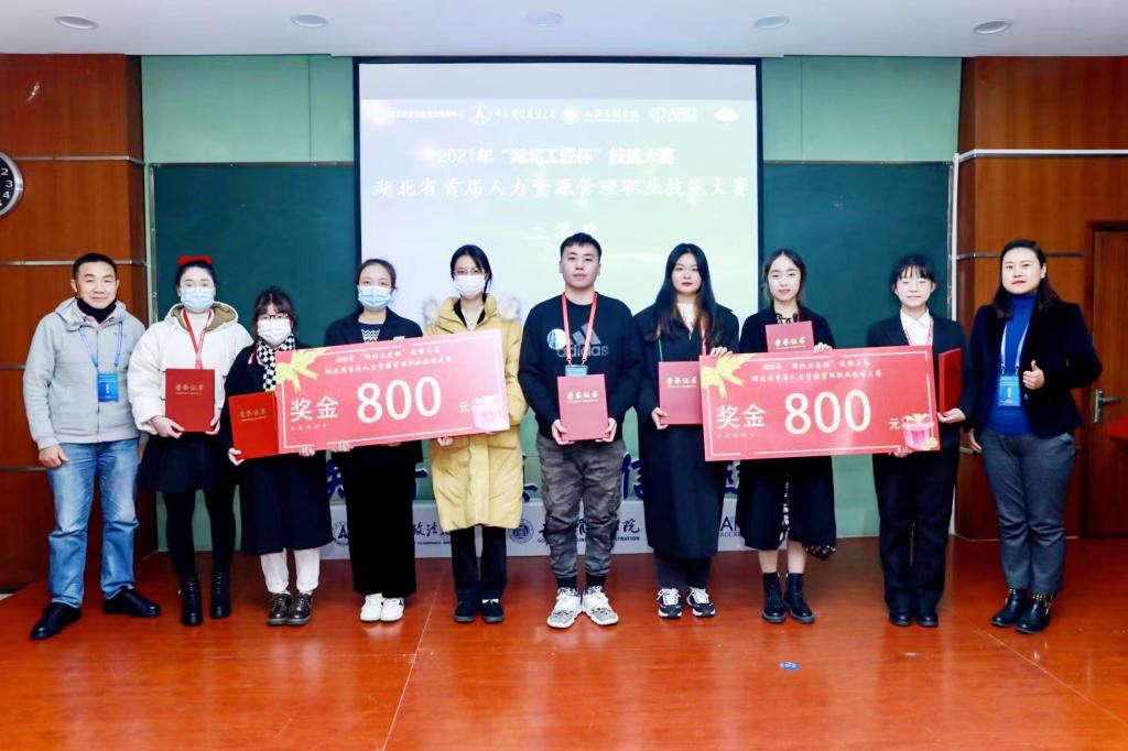 焦晴雨(右三)參加湖北省“工匠杯”人力資源管理職業技能大賽獲獎后與同學合影。