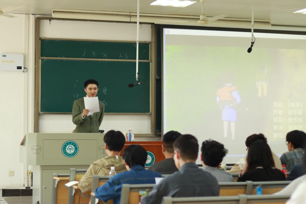 隨后,陳雨坤借助口腔模型講解了發(fā)音舌位,他聚焦于“j、q、x”三個(gè)聲母的本音發(fā)聲技巧,詳細(xì)解析了其舌位控制的關(guān)鍵點(diǎn),在理論講解之后,陳雨坤引導(dǎo)同學(xué)們現(xiàn)場(chǎng)進(jìn)行繞口令練習(xí),在實(shí)踐中讓學(xué)生親身體驗(yàn)并辨別各種發(fā)音的區(qū)別。為進(jìn)一步提升同學(xué)們的播音藝術(shù)感,陳雨坤以中國(guó)傳媒大學(xué)金北平老師的朗誦作品《散步》為例,倡導(dǎo)培養(yǎng)“聲掛前腭,聲音外送”的發(fā)聲路線意識(shí),強(qiáng)調(diào)以口腔共鳴為主導(dǎo),輔以胸腔共鳴,適度運(yùn)用鼻腔共鳴,以此塑造飽滿且富有感染力的聲音形象。針對(duì)廣播播音中的語(yǔ)言節(jié)奏把控,陳雨坤特別就連停的運(yùn)用原則做了詳盡闡述。
