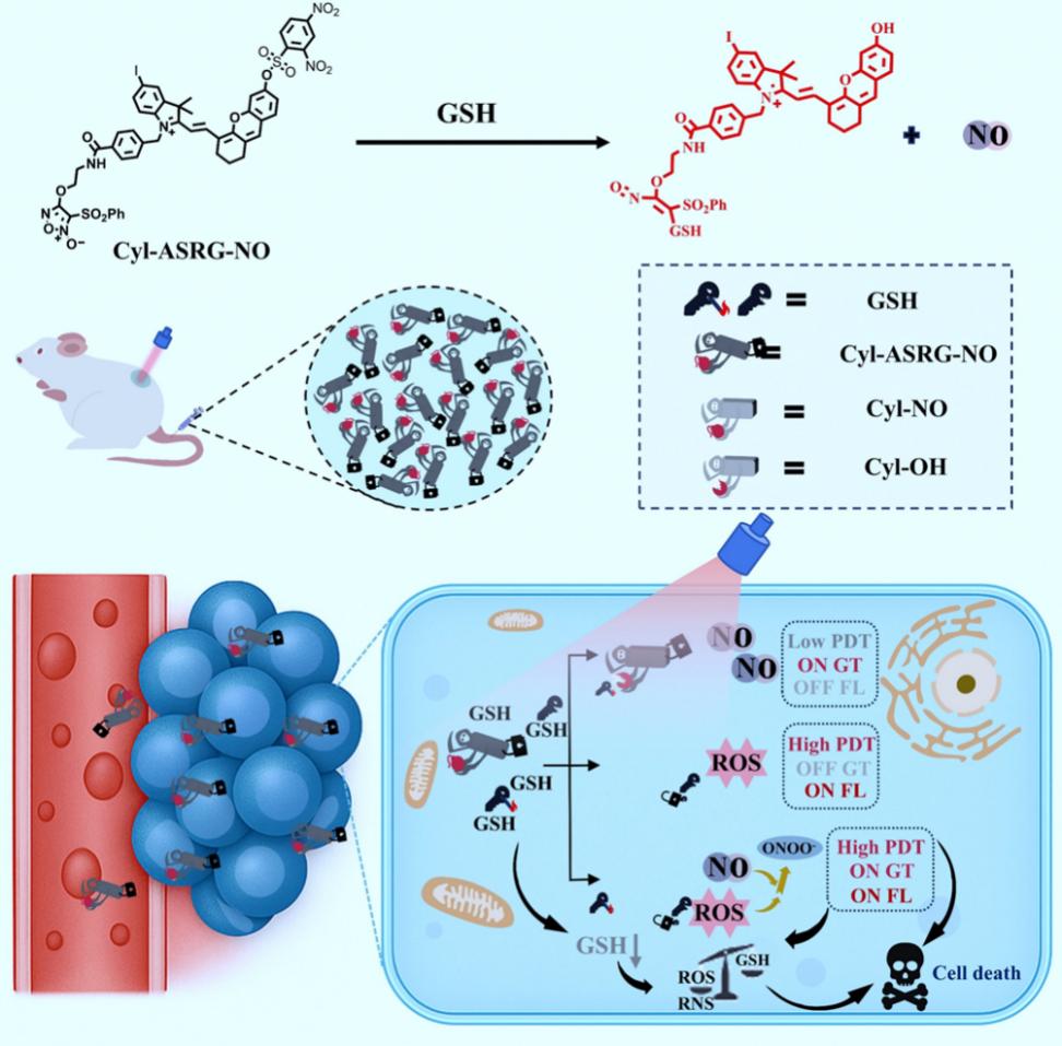 光敏劑分子結構、腫瘤部位生物硫醇激活釋放NO機理及近紅外光照下實現PDT/NO雙模式協同治療示意圖。化材學院供圖