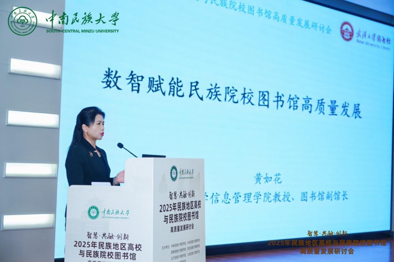 國家重大人才工程特聘教授、武漢大學圖書館副館長黃如花作題為《數智賦能民族院校圖書館高質量發展》的專題報告。她提出,人工智能時代的信息過載與虛假信息等問題日益突出,圖書館作為權威、可信的知識機構,應充分發揮其專業優勢,強化信息甄別能力,加強知識導航與學術資源評價服務。