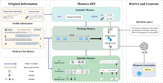 在醫療大語言模型多輪對話中,長期記憶缺失導致患者歷史信息丟失與診斷準確性下降。現有方法受限于固定上下文窗口或檢索機制,難以實現有效的動態記憶更新。為此,本研究提出MemoryART框架,借鑒自適應共振理論構建工作記憶、情景記憶與語義記憶三層系統,通過融合型自適應共振網絡實現穩定且高效的事件記憶編碼與合并,有效避免“原型坍塌”問題。基于構建的長程醫療對話數據集MediLongChat與多項推理任務實驗表明,MemoryART在多個主流大模型上顯著提升長期記憶與推理能力,在跨對話推理任務中F1分數提升達+14.88,并在降低約60% token消耗的同時保持最優性能,在公共數據集上也達到SOTA水平。