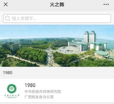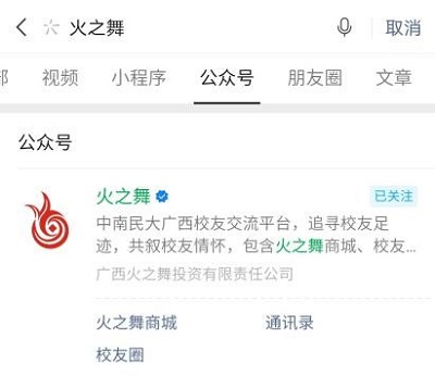 微信搜索“火之舞”,選擇“公眾號”,選擇后關注公眾號,點擊“通訊錄”,注冊校友信息,等待審核通過后可以在通訊錄中首個人中看到廣西校友會辦公室,點擊可以私信辦公室發信息,也可以在公眾號推文和校友圈中看到廣西校友最新活動及詳情。