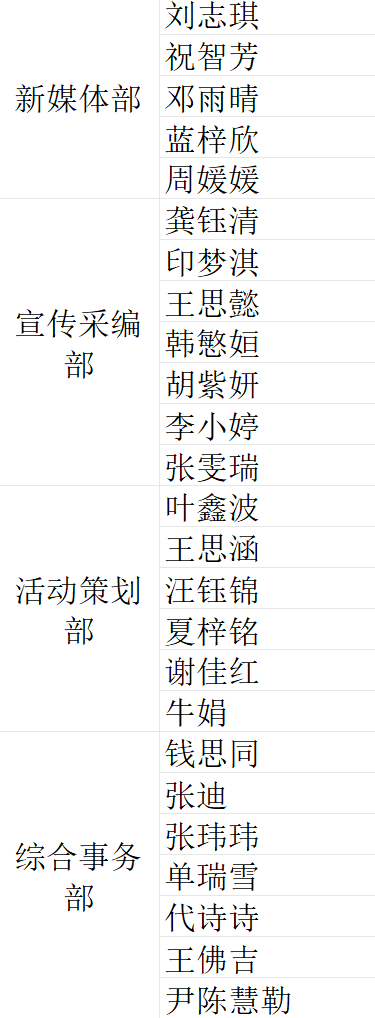 校友聯絡社學生成員選拔工作本著公平公正公開的原則,經學生報名、資格審查、面試面談等環節,共選出25名同學為校友聯絡社新成員。現將名單公示如下: