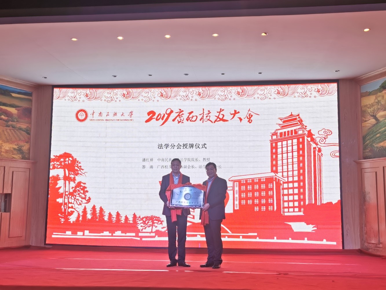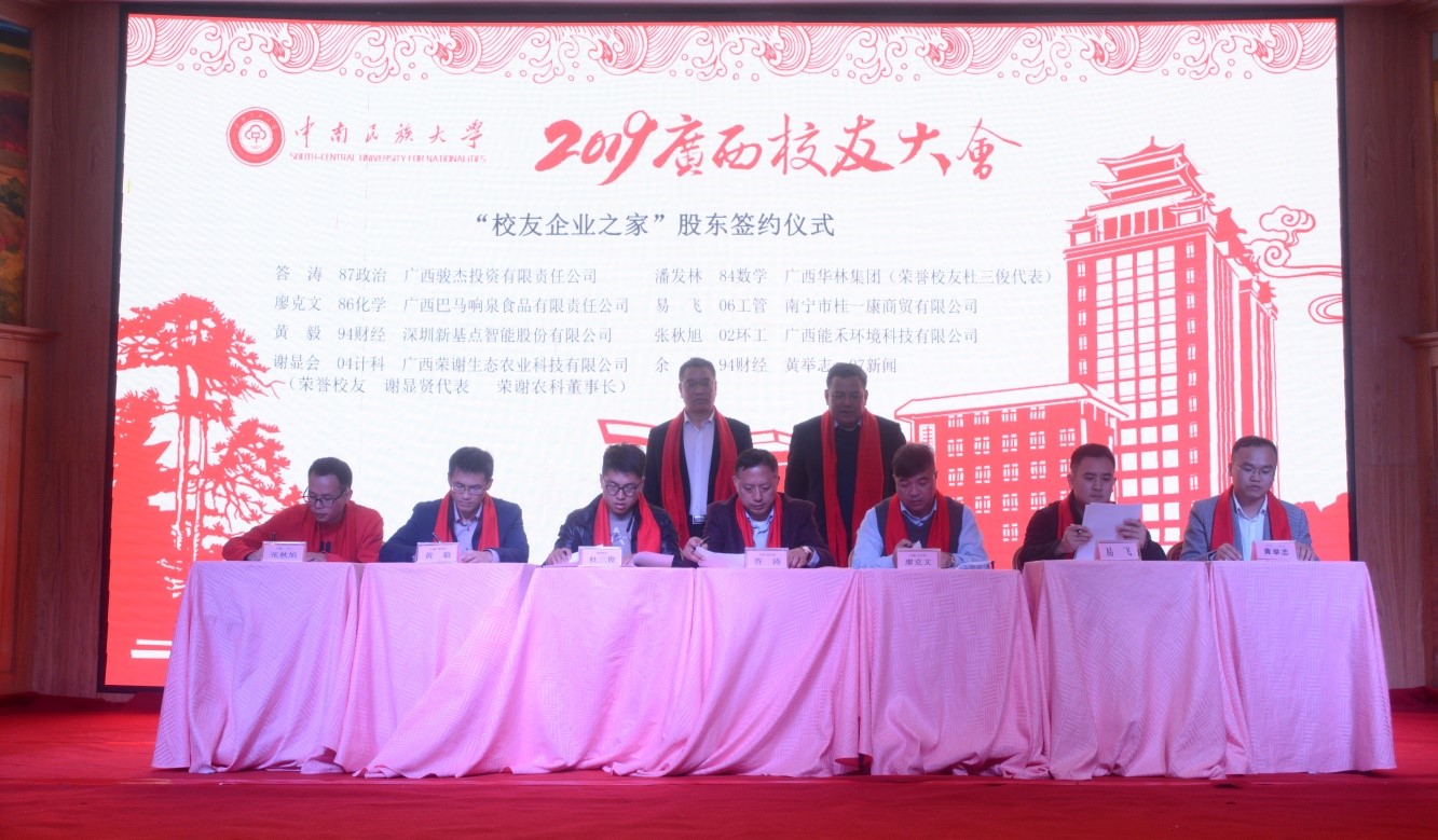 大會首先由廣西校友會會長黃全勝作廣西校友會近年來工作報告。隨后,中南民大廣西校友企業之家“廣西火之舞投資有限責任公司”舉行股東簽約儀式和會員單位簽約儀式,“校友企業之家”正式宣告成立。會上,學校領導、法學院領導、廣西校友會領導共同為新成立的廣西“校友企業之家”和廣西校友會法學分會授牌。