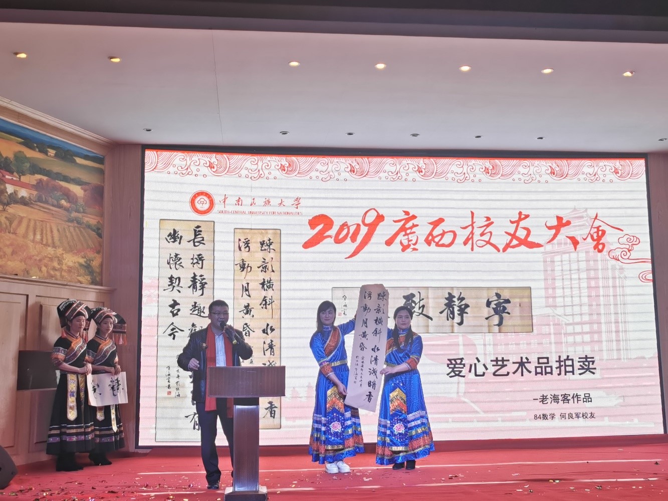 為進一步做好捐資助學工作,會上,還對校友所捐書畫作品進行義賣,共計9萬余元,所得款項將注入廣西校友會助學金,資助母校廣西籍貧困學生。截止今年上半年廣西校友會已連續六年捐贈助學金共30余萬元,在助力學生順利成長成才方面起到了積極作用。