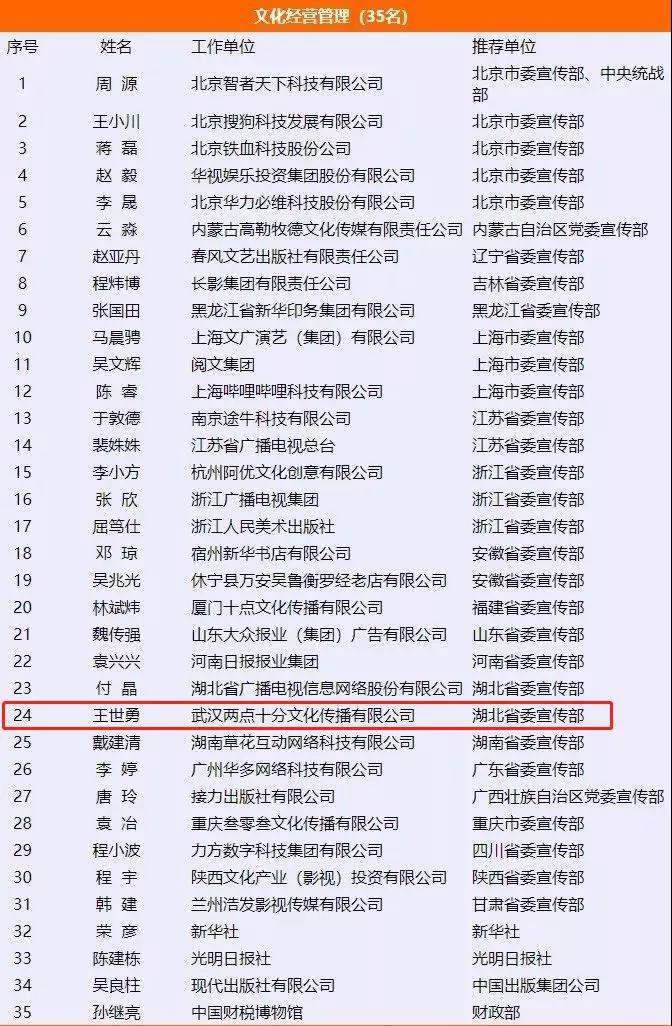 2019年12 月 31 日,中央宣傳部干部局公示了 2019 年文化名家暨“四個一批”人才、宣傳思想文化青年英才擬入選人選名單,我校01級藝術設計專業校友、兩點十分動漫創始人王世勇入選文化名家暨宣傳思想文化青年英才文化經營管理領域 35 人名單。 文化名家暨“四個一批”人才工程項目系國家實施高層次人才隊伍建設和宣傳思想文化人才隊伍建設的重大戰略政策。文化名家暨“四個一批”人才主要從理論界、文藝界、新聞界、國際傳播、文化經營管理和出版界的專家學者中評選,是衡量一省文化軟實力的重要指標之一。 此次入選 2019 文化名家暨“四個一批”人才、宣傳思想文化青年英才名單人選還包括吳京、徐崢、張涵予、章子怡、沈騰、網易創始人丁磊、嗶哩嗶哩彈幕董事長陳睿、閱文集團CEO吳文輝、《哪吒之魔童降世》導演餃子等。