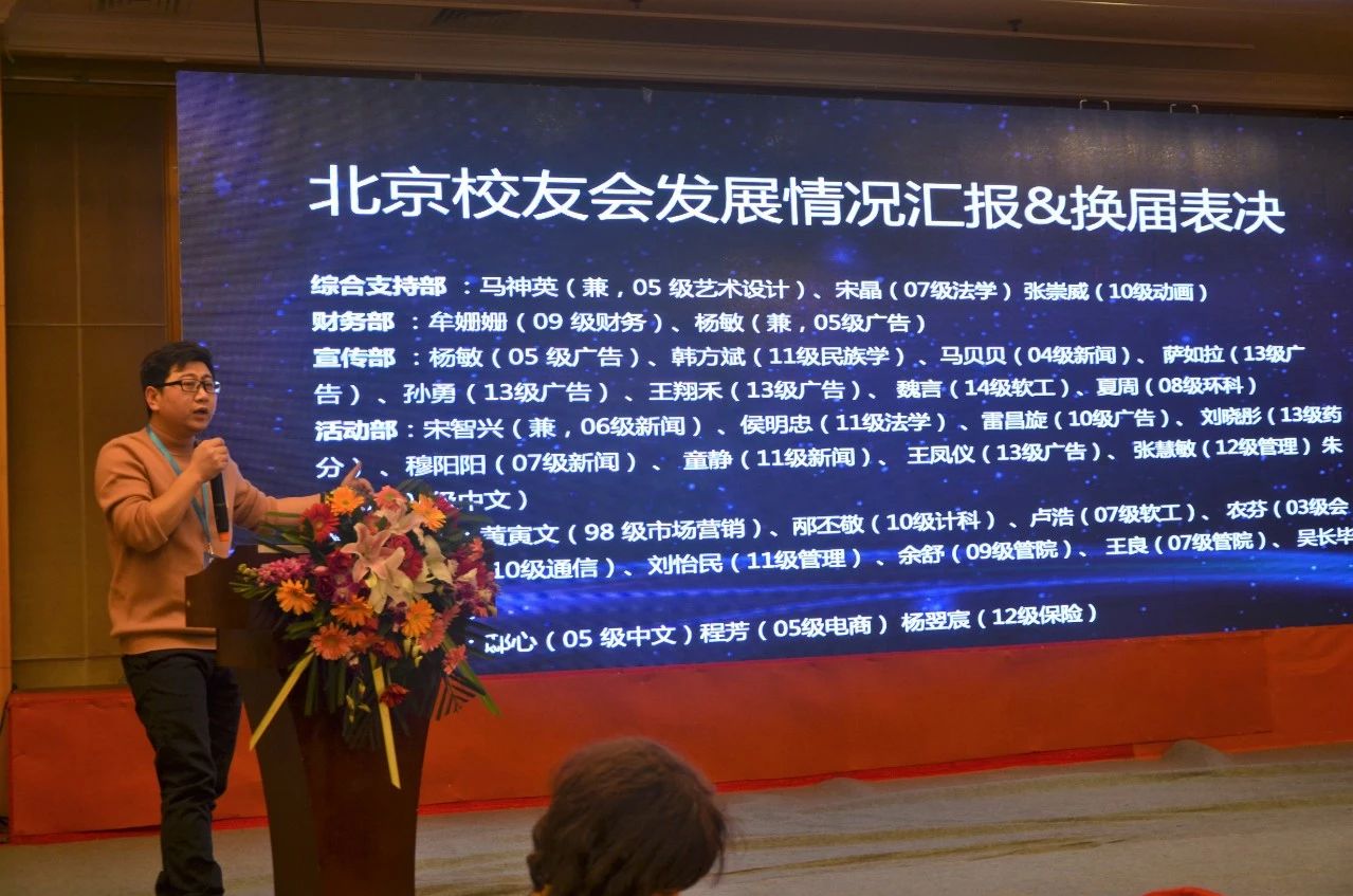 北京校友會第四屆執(zhí)行會長廖鋒作為機(jī)構(gòu)代表回顧了北京校友會十年發(fā)展歷程和取得成果,并主持機(jī)構(gòu)換屆表決和主持榮譽(yù)顧問團(tuán)聘請儀式。