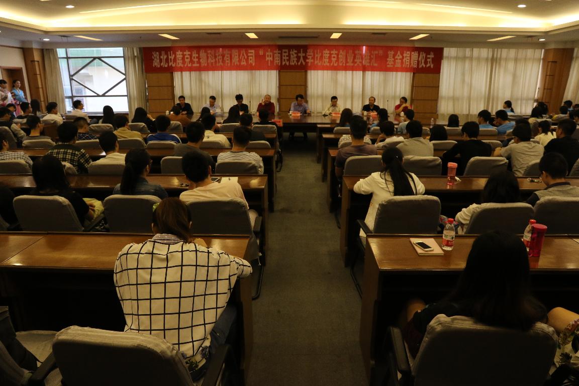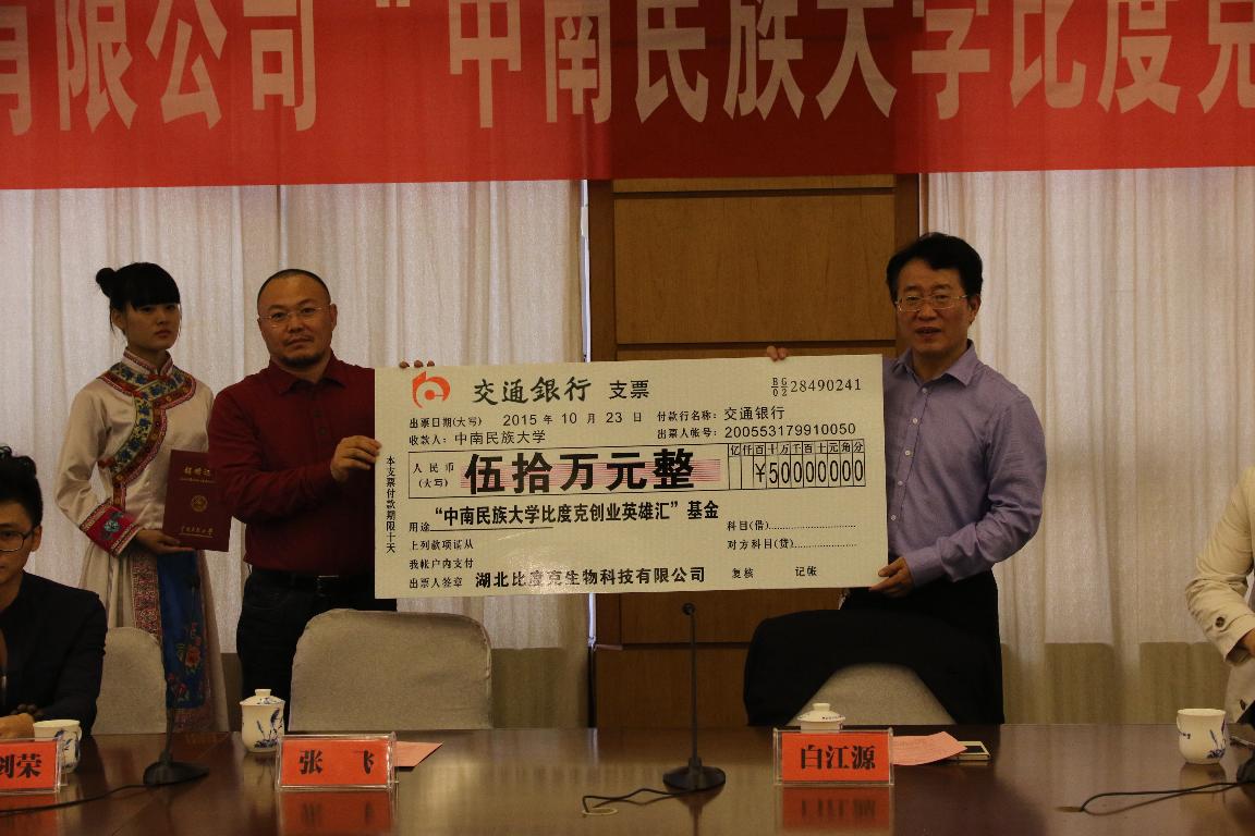 10月23日上午,全國“雙創(chuàng)”周活動進(jìn)入第4天,校友助力學(xué)校創(chuàng)新創(chuàng)業(yè)工作結(jié)出碩果。我校1991級校友、湖北比度克生物科技有限公司董事長張飛捐資我校設(shè)立“創(chuàng)業(yè)英雄匯”基金會捐贈儀式在學(xué)術(shù)交流中心舉行。校黨委副書記、校教育發(fā)展基金會理事長白江源出席并稱贊此舉有利于助推民大學(xué)子圓“創(chuàng)客”夢。捐贈儀式由副校長李俊杰主持。學(xué)校宣傳部、校友辦、創(chuàng)新創(chuàng)業(yè)中心相關(guān)負(fù)責(zé)人和入駐學(xué)校科技孵化器的創(chuàng)業(yè)學(xué)生共200余人參加。