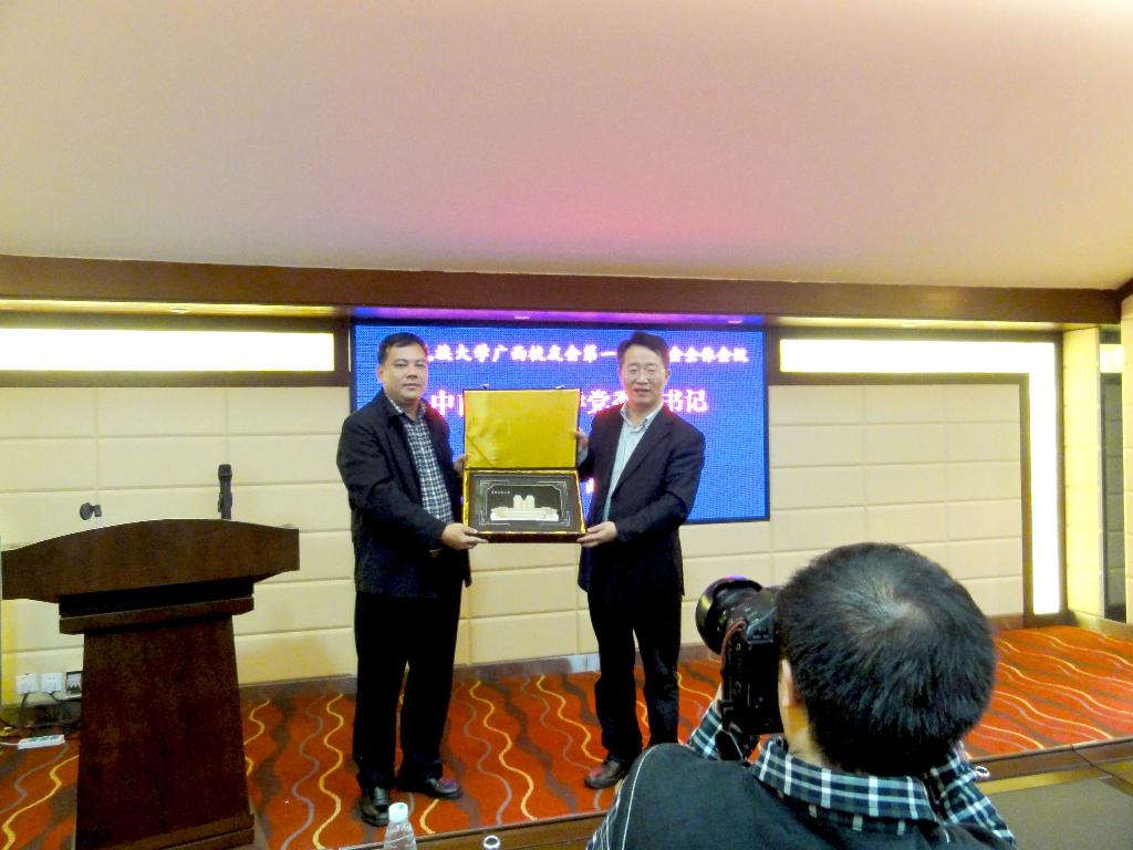 白江源代表學(xué)校對(duì)廣西校友會(huì)成立一周年表示衷心祝賀,對(duì)廣西校友會(huì)成立以來(lái)的工作給予充分的肯定。并對(duì)廣西校友會(huì)提出了希望,他表示校友是學(xué)校辦學(xué)的寶貴資源和財(cái)富,廣西校友會(huì)是廣大廣西校友和母校之間聯(lián)絡(luò)的重要紐帶,廣西校友會(huì)應(yīng)做大做強(qiáng)這個(gè)校友的服務(wù)平臺(tái),并利用好這一平臺(tái)支持校友更好的事業(yè)發(fā)展,同時(shí)密切聯(lián)系母校,更好的為學(xué)校發(fā)展服務(wù)。他還代表學(xué)校向廣西校友會(huì)贈(zèng)送了銀飾畫(huà)以示慶賀。
