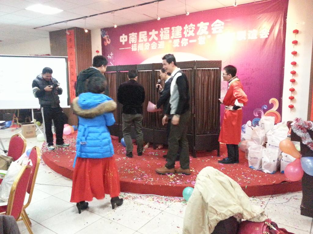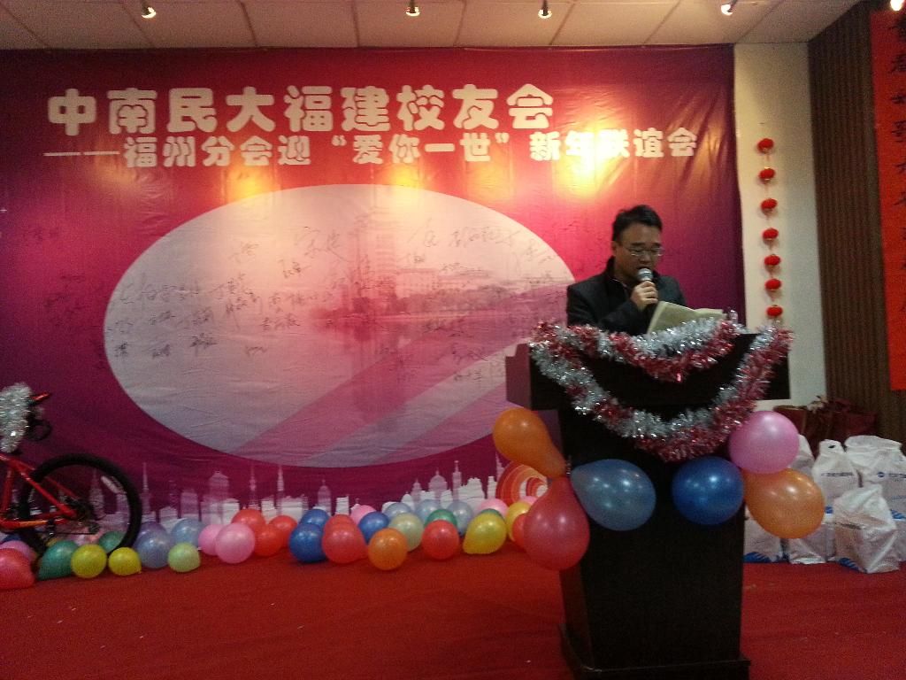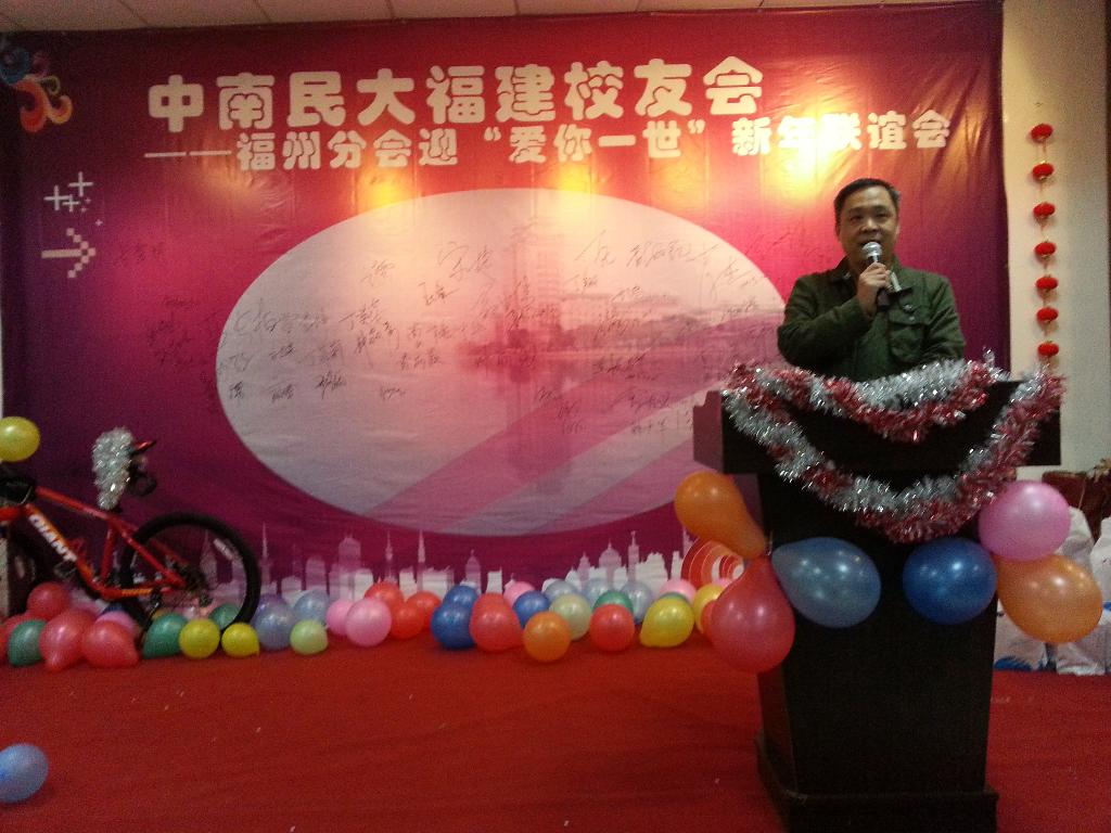 12月21日晚,2013年中南民大福建校友會福州分會迎“愛你一世”新年聯誼會在福州天和源舉行,福州校友近100人歡聚一堂,校友辦主任陳強勝、校友辦工作人員劉毅、福建各地分會會長及秘書長代表到會祝賀。