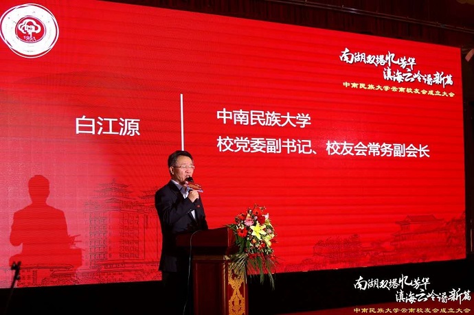 校黨委副書記白江源代表學校向云南校友會的成立表示熱烈地祝賀并向云南校友會贈授會牌,他對為籌備本次會議付出辛勤汗水的校友們表示衷心的感謝,向在滇全體校友致以親切問候。他向各位校友介紹了近年來學校在人才培養(yǎng)、科學研究、社會服務等方面所取得成績。并對云南校友會提出三點希望,一是堅持以服務校友為宗旨,不斷加強云南校友會的自身建設。通過云南校友會的成立,為廣大云南校友搭建一個更為廣闊的感情交流平臺、事業(yè)發(fā)展平臺,信息交流平臺。二是堅持以服務社會為使命,不斷凝聚云南校友的聰明才智。希望云南校友會能夠積極引導廣大云南校友,積極投身地方發(fā)展,貢獻“民大人”的智慧和力量。三是堅持以愛校興校為共同責任,不斷密切母校與校友的溝通聯(lián)系。