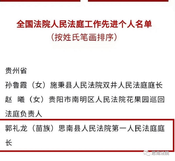 郭禮龍,男,1987年9月出生,貴州省思南縣人,苗族,2008年畢業(yè)于中南民族大學(xué)法學(xué)專業(yè),2009年2月進(jìn)入貴州省思南縣人民法院工作,現(xiàn)任思南縣人民法院第一人民法庭(現(xiàn)許家壩人民法庭)庭長、一級法官。自參加工作以來,他用行動捍衛(wèi)法律尊嚴(yán),用真情贏得百姓信任,用堅守踐行司法為民的初心使命。2018年,被銅仁市中級人民法院記個人三等功一次,被思南縣委政府評為全縣勞動模范。多次被思南縣人民法院評為先進(jìn)個人。