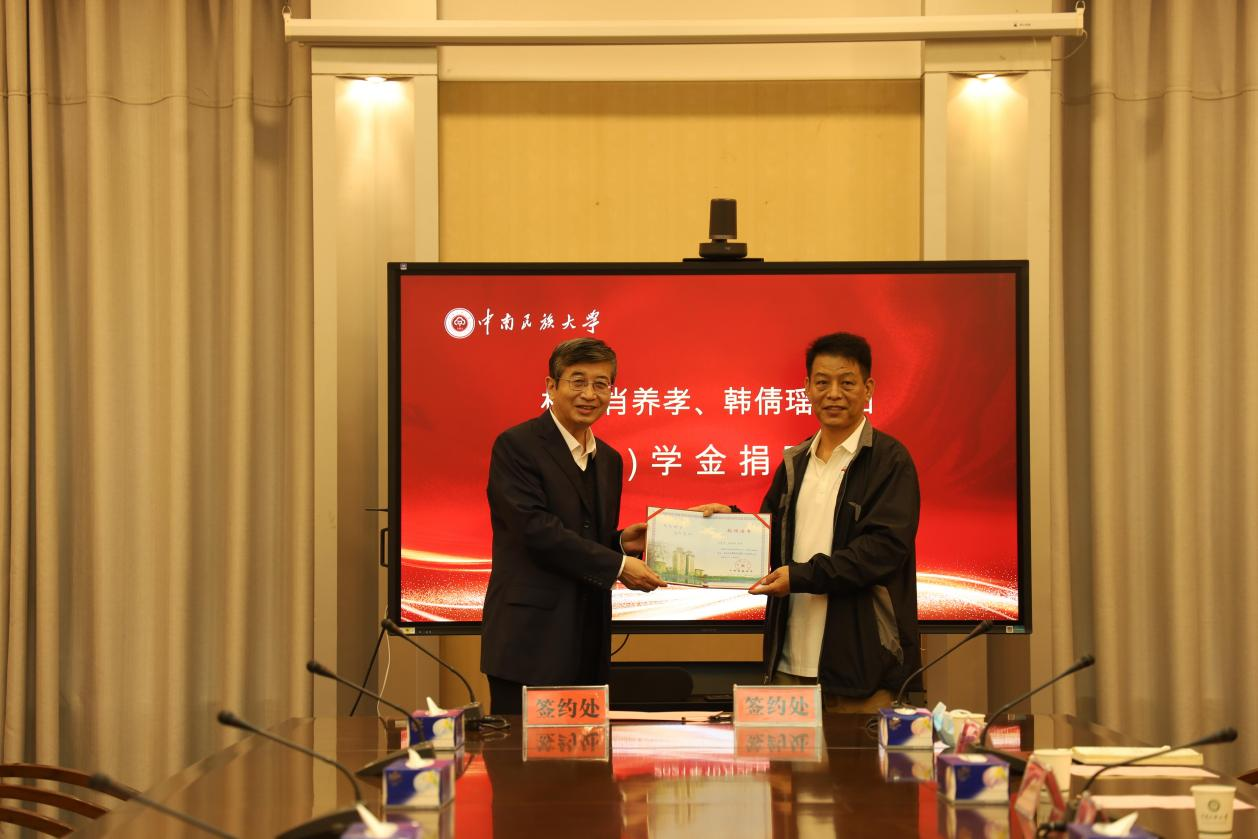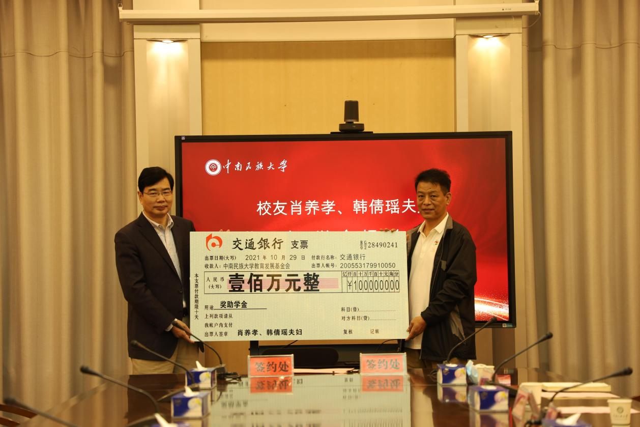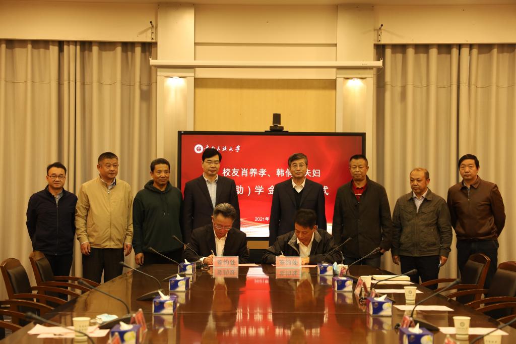 捐贈儀式上,校友肖養孝、韓倩瑤夫婦向學校教育發展基金會捐贈獎(助)學金100萬元。白江源代表校教育發展基金會與肖養孝簽訂捐贈協議。