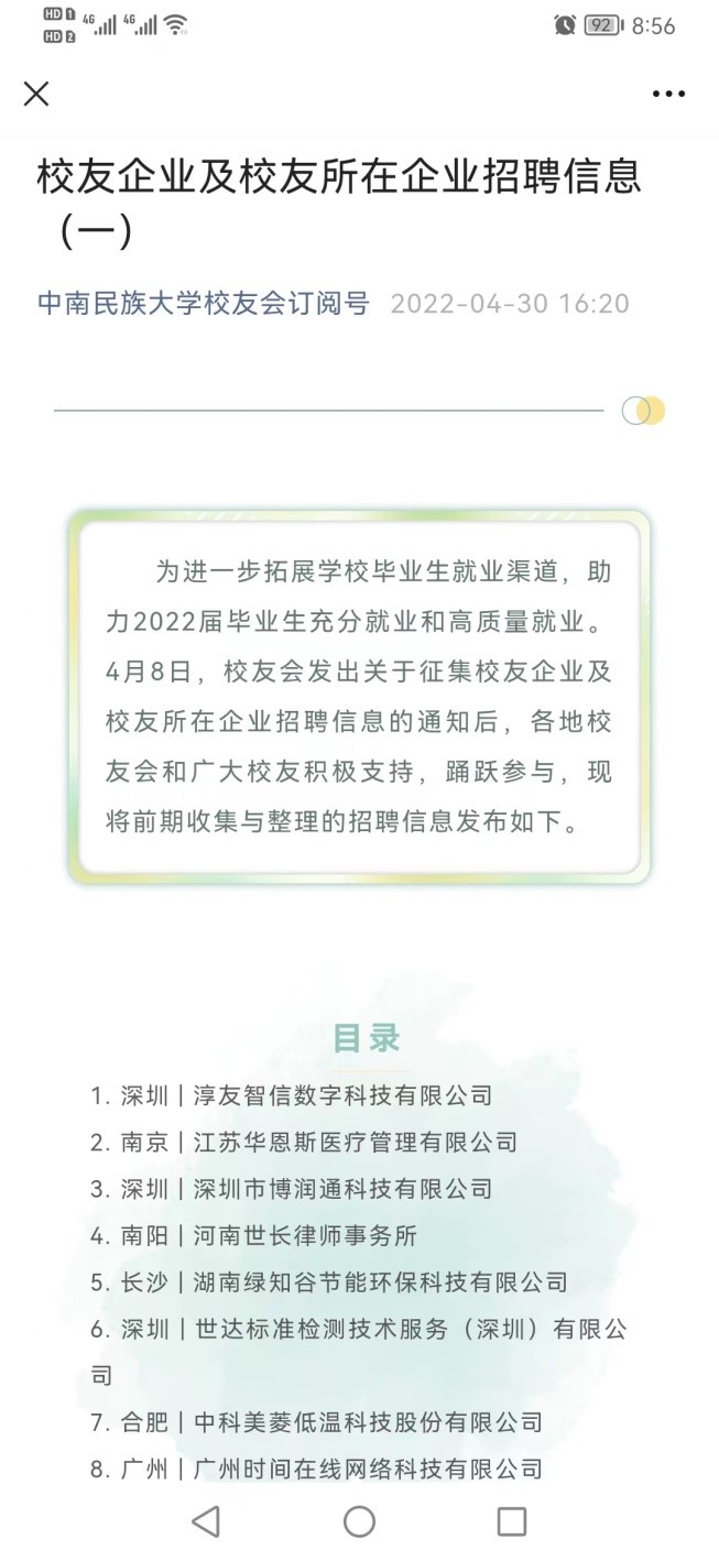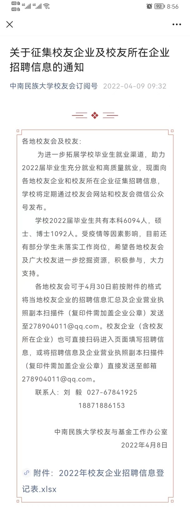 為進一步拓展學校畢業生就業渠道,助力2022屆畢業生充分就業和高質量就業。4月8日,中南民族大學校友會面向各地校友會及校友發出《關于征集校友企業及校友所在企業招聘信息的通知》。各地校友會和廣大校友積極支持,踴躍參與,多家校友企業及校友所在企業陸續提供百余個就業崗位。