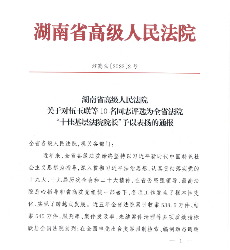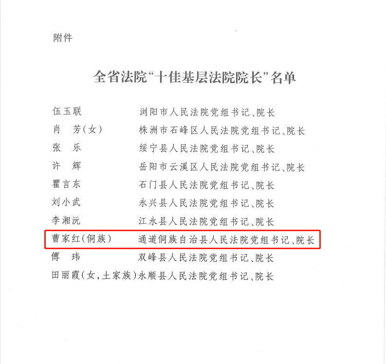 2023年1月,湖南省高級(jí)人民法院發(fā)布了《關(guān)于對(duì)伍玉聯(lián)等10名同志評(píng)選為全省法院“十佳基層法院院長(zhǎng)”予以表?yè)P(yáng)的通報(bào)》,我校1993級(jí)原政法系(現(xiàn)法學(xué)院)校友,通道侗族自治縣人民法院黨組書記、院長(zhǎng)曹家紅被評(píng)為湖南省法院“十佳基層法院院長(zhǎng)”。