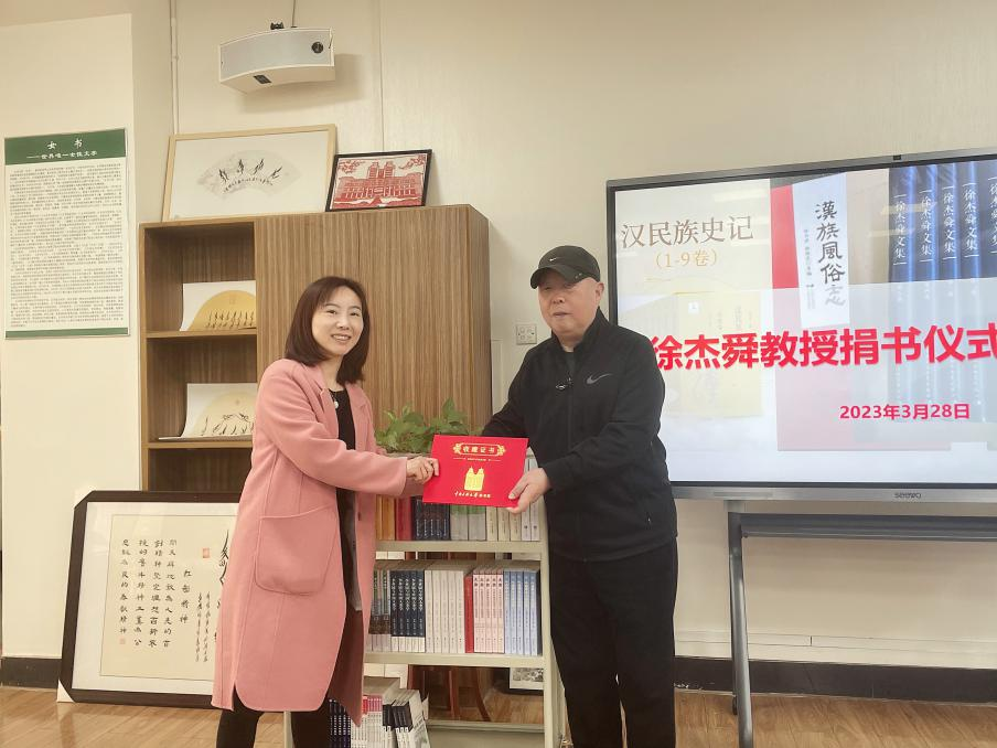徐杰舜教授共向圖書館捐贈了《漢民族史記》《漢族風俗志》《徐杰舜文集》等圖書共計19種82冊,大多為其個人著述。圖書館館長饒映雪代表圖書館接受捐贈并致謝。她向徐教授頒發了收藏證書,表示圖書館一定會利用好這批圖書為師生服務,使之發揮應有的作用。