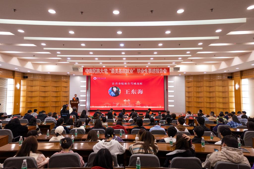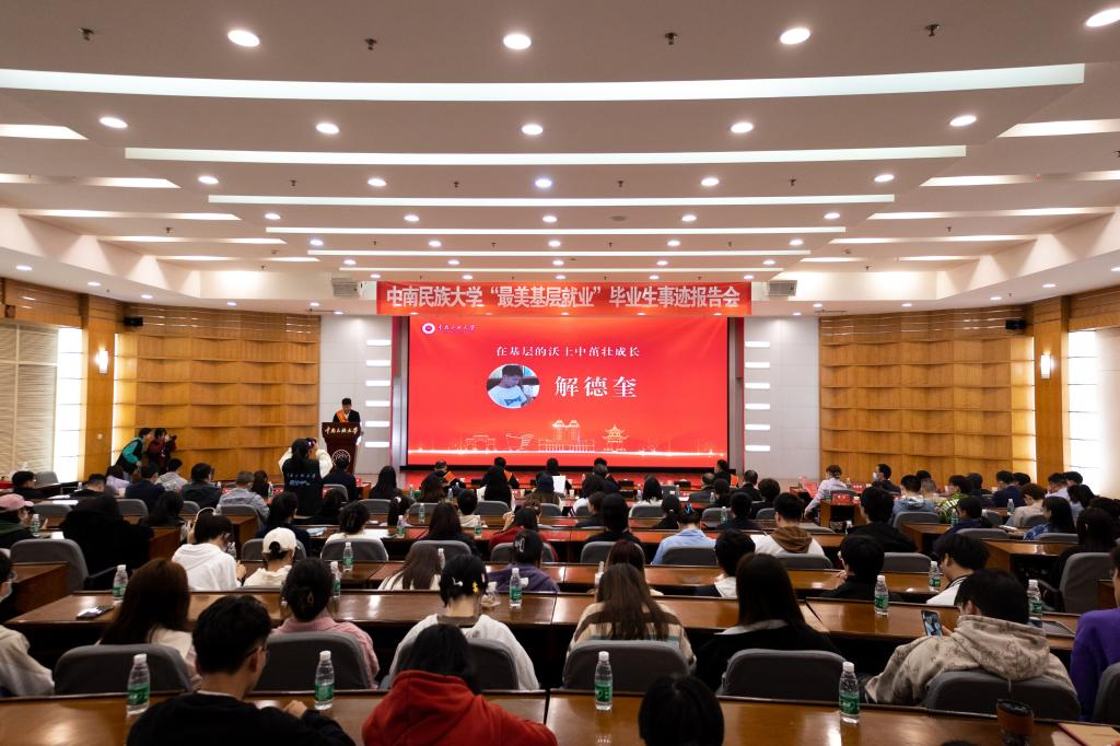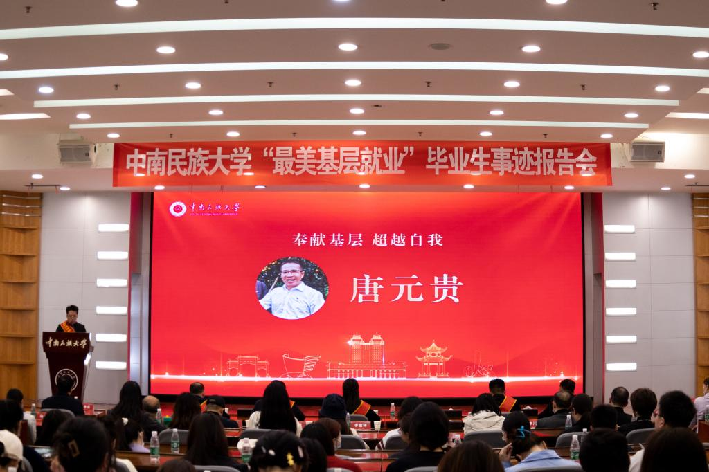 “近年來,中南民族大學認真貫徹落實上級有關精神,鼓勵學生腳踏實地,到祖國和人民最需要的地方去建功立業,涌現出一批批投身基層的畢業生。”副校長杜冬云介紹舉辦此次活動的初衷:“就業是民生之本。穩就業是當前學校工作面臨的重要任務。我們邀請來自全國各地最基層的6位校友舉行事跡報告會,分享他們在基層工作的故事,目的就是通過發揮榜樣的示范作用,引導廣大學生面向基層,到基層去,扎根基層,到祖國和人民最需要的地方去,與祖國同呼吸,與人民同命運,為中華民族的偉大復興貢獻力量。