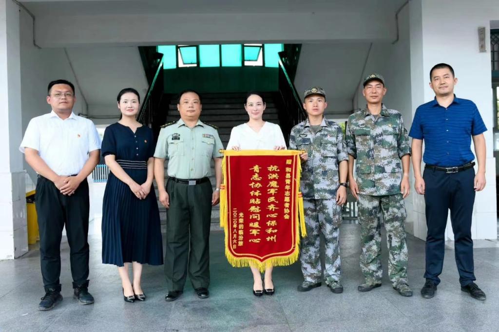 抗洪官兵為青年志愿者協(xié)會贈送錦旗(左一)