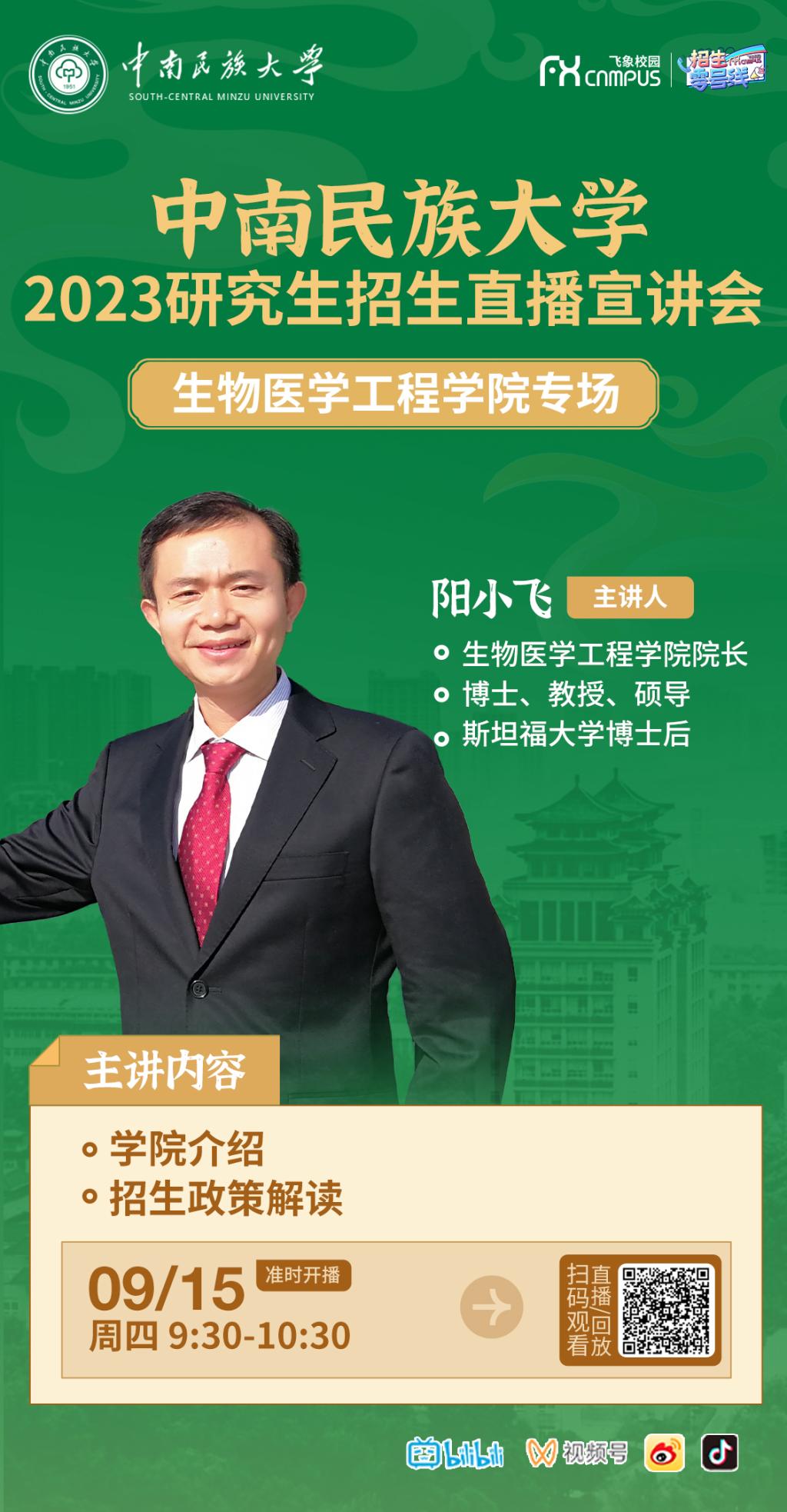 中南民族大學2023年研究生招生線上系列宣講會之一------生物醫學工程學院專場(9月15日 9:30)