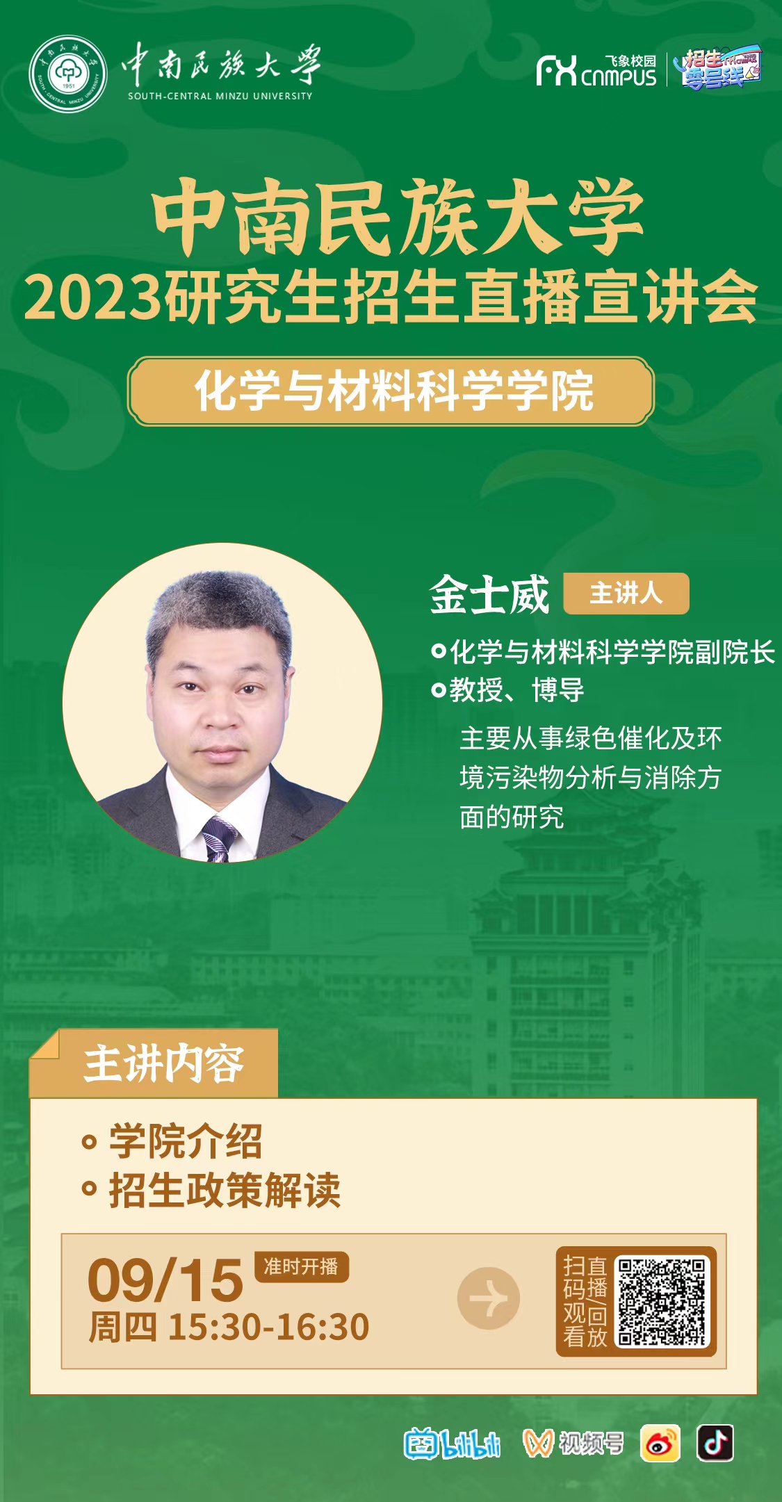 中南民族大學2023年研究生招生線上系列宣講會之二------化學與材料科學學院專場(9月15日 15:30)