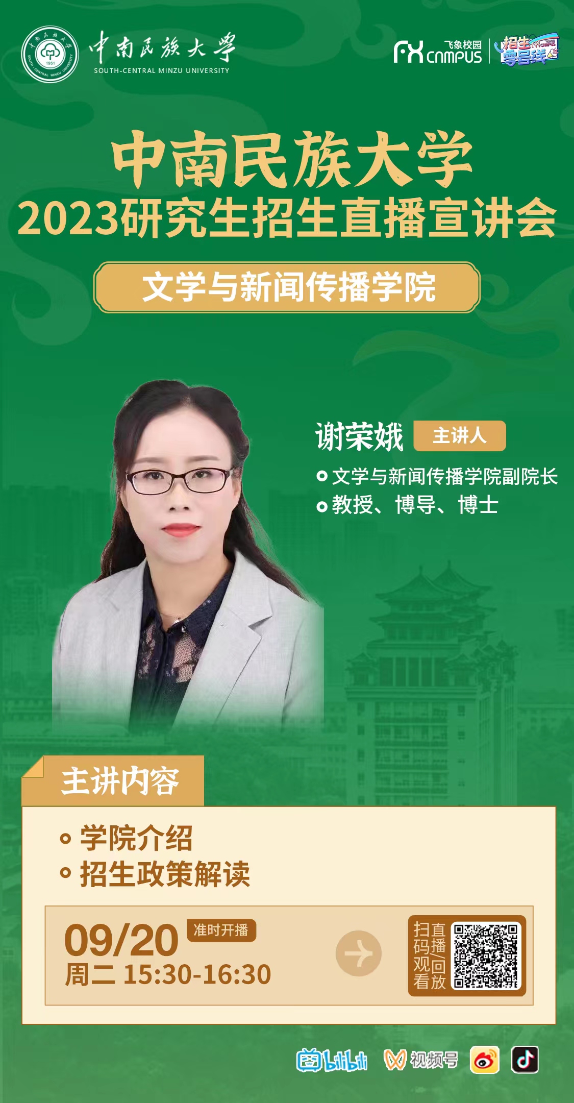 中南民族大學(xué)2023年研究生招生線上系列宣講會之五------文學(xué)與新聞傳播學(xué)院專場(9月20日 15:30)
