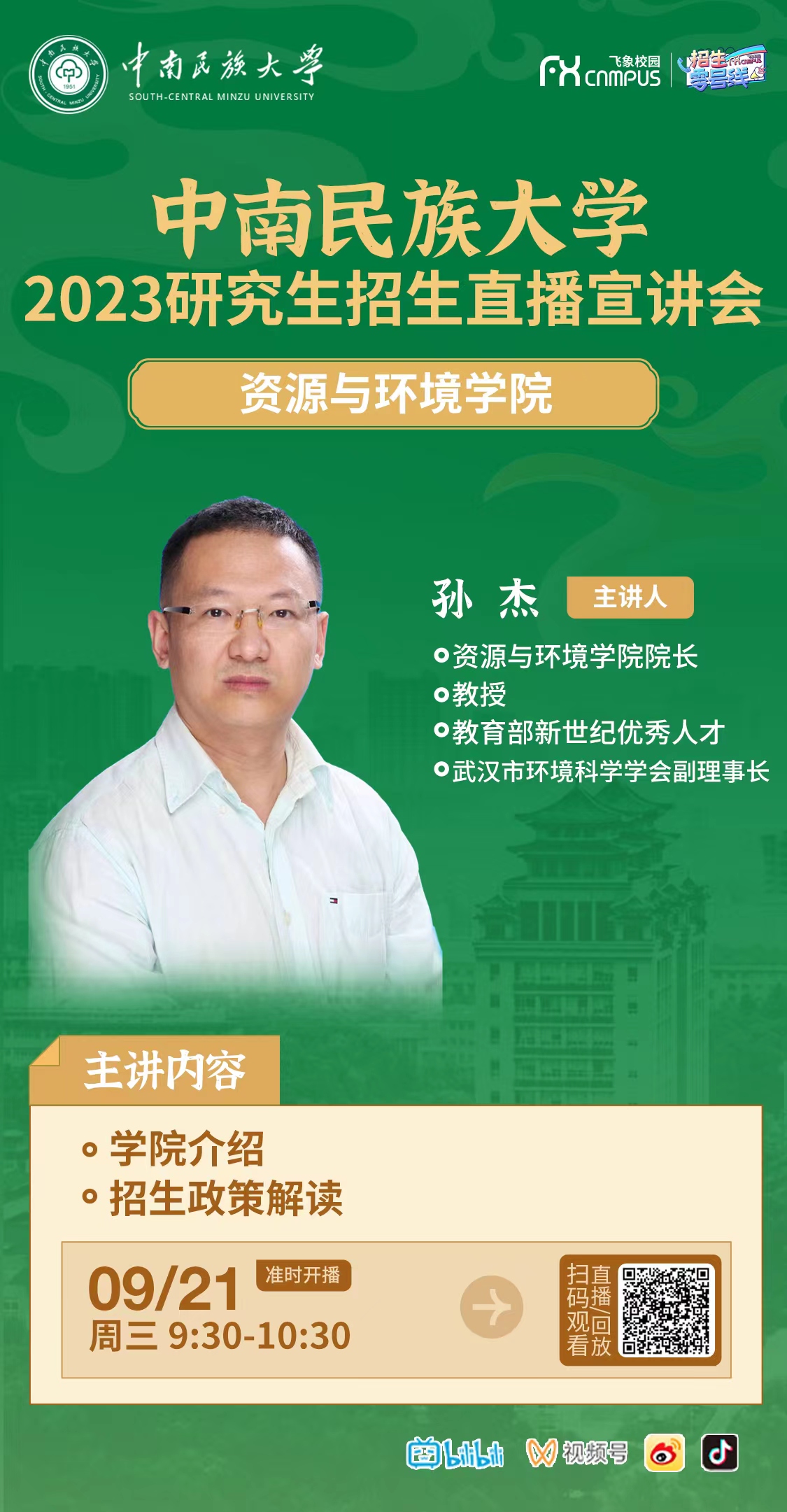 中南民族大學2023年研究生招生線上系列宣講會之六------資源與環(huán)境學院專場(9月21日 9:30)