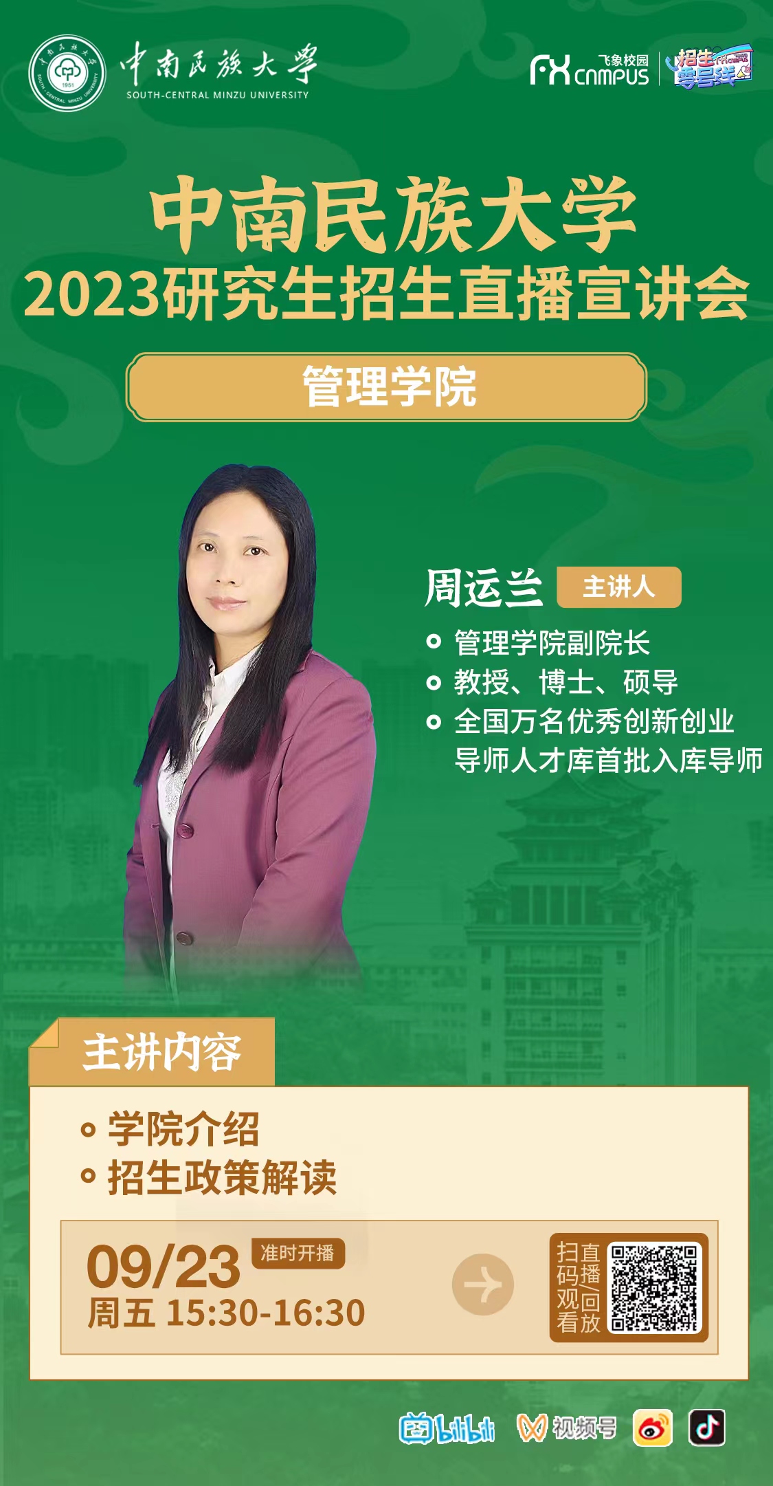 中南民族大學2023年研究生招生線上系列宣講會之十------管理學院專場(9月23日 15:30)