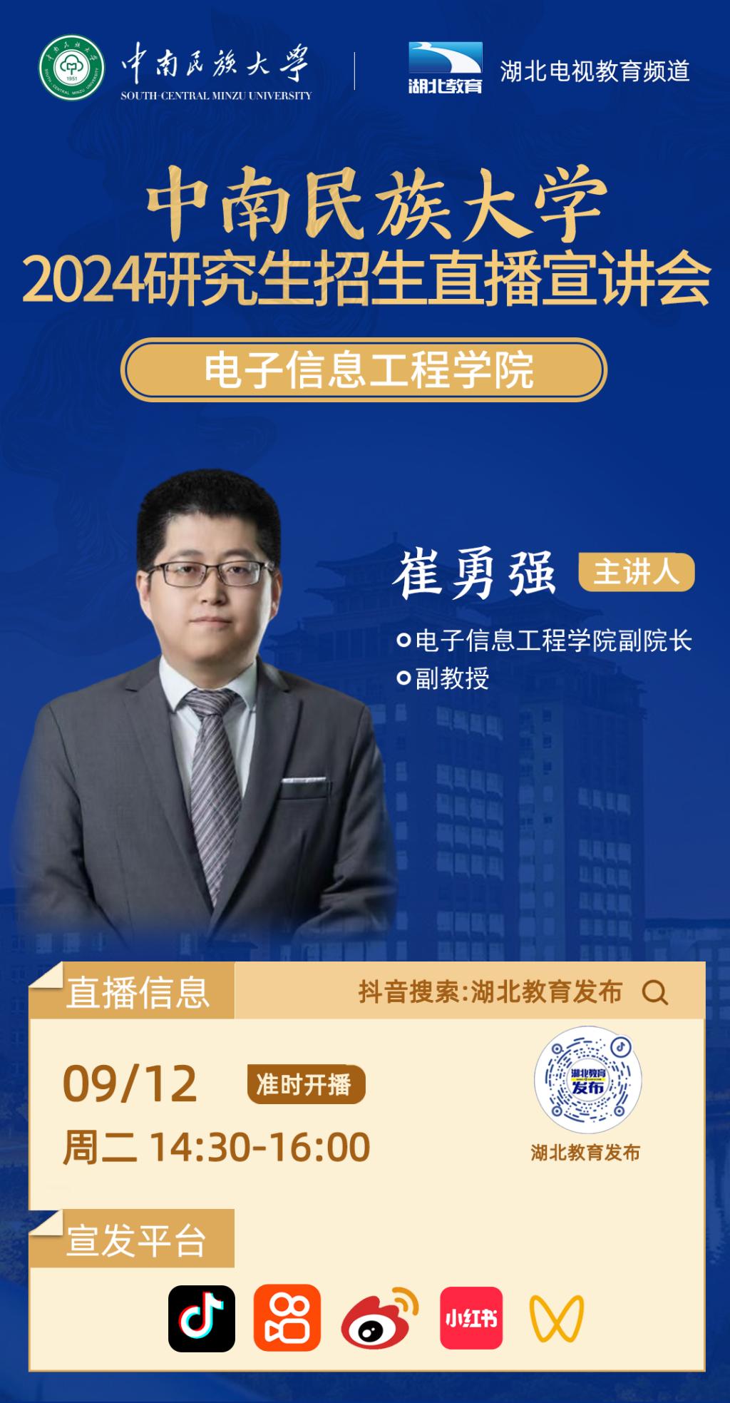 中南民族大學2024年研究生招生線上系列宣講會之一------電子信息工程學院專場(9月12日 14:30)