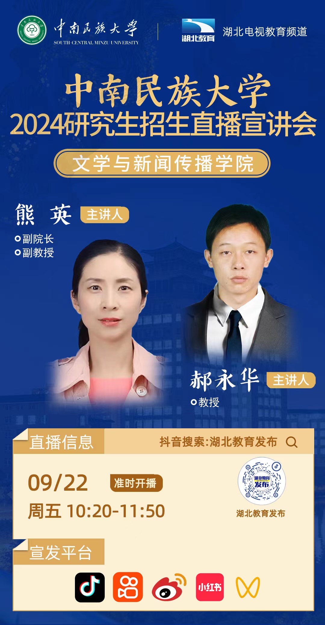 中南民族大學2024年研究生招生線上系列宣講會之十三------文學與新聞傳播學院專場(9月22日 10:20)