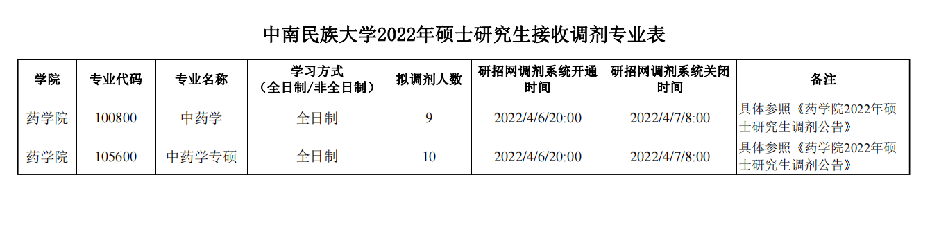 中南民族大學2022年碩士研究生接收調劑專業表