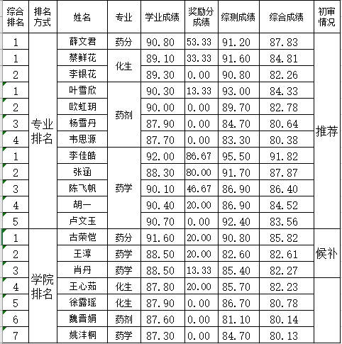 藥學院2023屆本科畢業生推免學院公示表