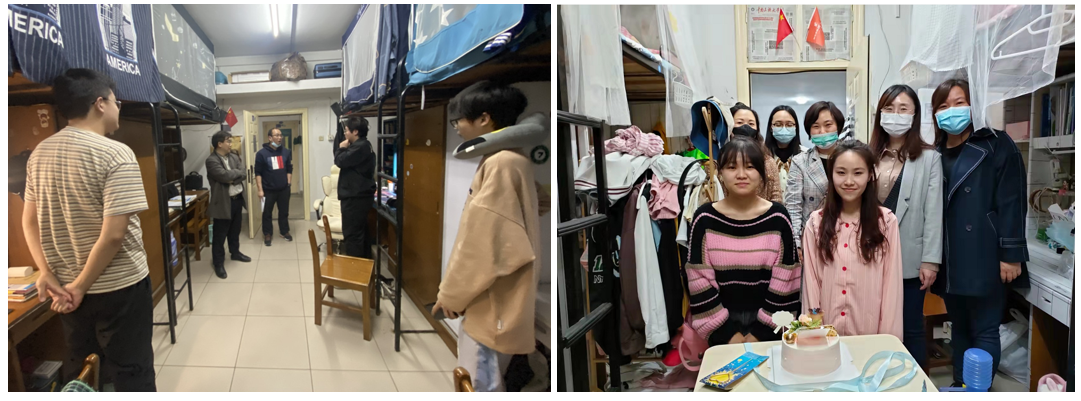 院黨委書記江瑩一行在15棟女生宿舍樓走訪。在15棟宿舍樓,恰逢藥學2104班張紓溶過生日,老師們為她送上美好祝福,祝愿她在民大學有所成、夢想成真,度過美好的大學四年。輔導員李丹、班導師劉慶培建議同學們利用閑暇時間,加強體育鍛煉,提高身體免疫力。