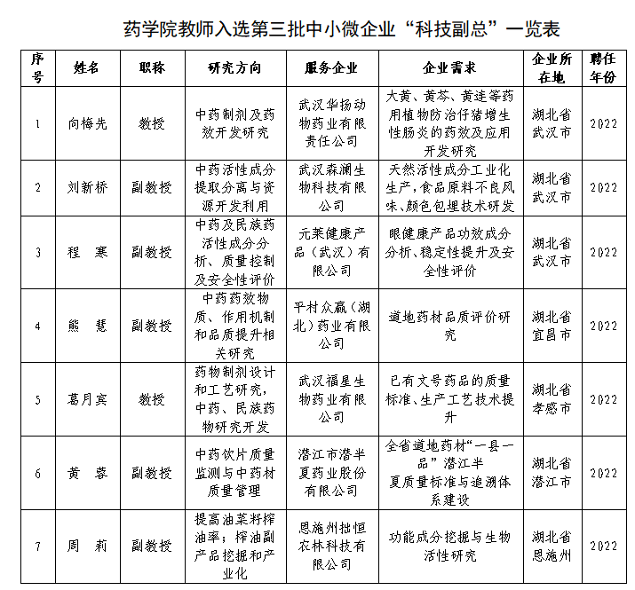 近日,中共湖北省委人才工作領導小組辦公室湖北省經濟和信息化廳印發《關于選派第三批中小微企業“科技副總”人選的通知》(鄂經信科技〔2022〕51號),藥學院向梅先等7名教師入選“科技副總”人選,人數位居全校前列。