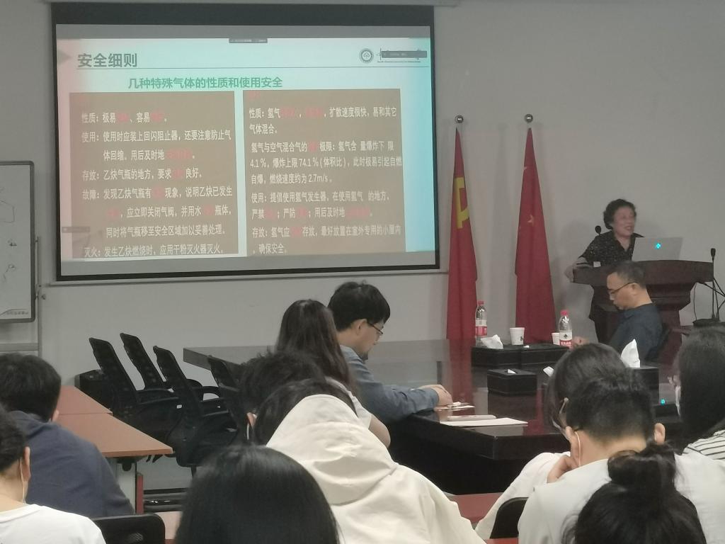 實驗室安全無小事!江瑩以近年來高校發(fā)生的重大實驗室安全事故切入,強調安全是一切工作的底線,師生開展實驗必須堅持生命至上、安全為先的原則,對自己負責,對大家負責。吳士筠結合自身40余年的實驗員工作經(jīng)歷,對實驗室安全事故類型、實驗室安全管理、急救處理、消防安全、化學危險品安全、氣瓶及壓力容器使用安全、輻射危害與防護及其他安全問題進行了系統(tǒng)、全面的培訓,并以鮮活的安全警示案例提醒同學們要堅持“安全第一預防為主”的方針,認真做好安全隱患的排查與整改。同時針對藥學院實驗室相關的安全問題,如危險化學品的采購管理、氣瓶管理、實驗室安全防護品、特種設備操作規(guī)程、危險化學品柜操作及制度建設、廢液管理及處理等進行深入的講解。