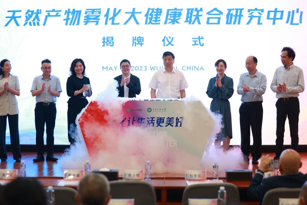 5月19日上午,天然產物霧化大健康聯合研究中心揭牌暨思摩爾獎學金頒發儀式在學術交流中心舉行。校黨委常委、副校長杜冬云,思摩爾國際高級副總裁熊少明、副總裁吳俊蘭、副總裁張冰、人力資源高級總監龍雙全,天然產物霧化大健康聯合研究中心負責人劉吉開、學校相關部門負責人和師生代表參加了會議。會議由校黨委常委、紀委書記韓葉盛主持。